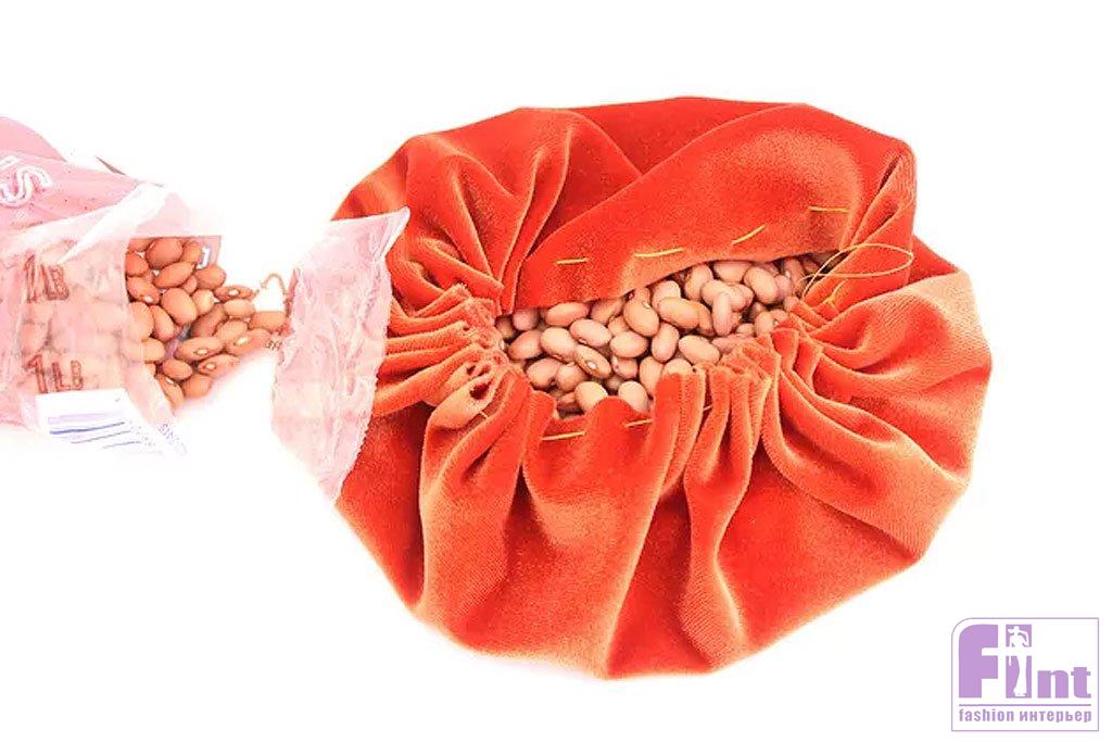 Положите примерно половину стакана сушёной фасоли или обычного риса в получившийся бархатный мешочек. Фасоль или рис послужат нам в качестве утяжелителя, чтобы тыква не падала на бок и стояла ровно.
