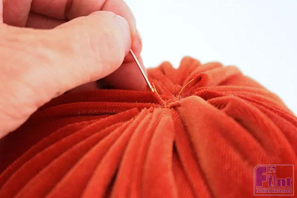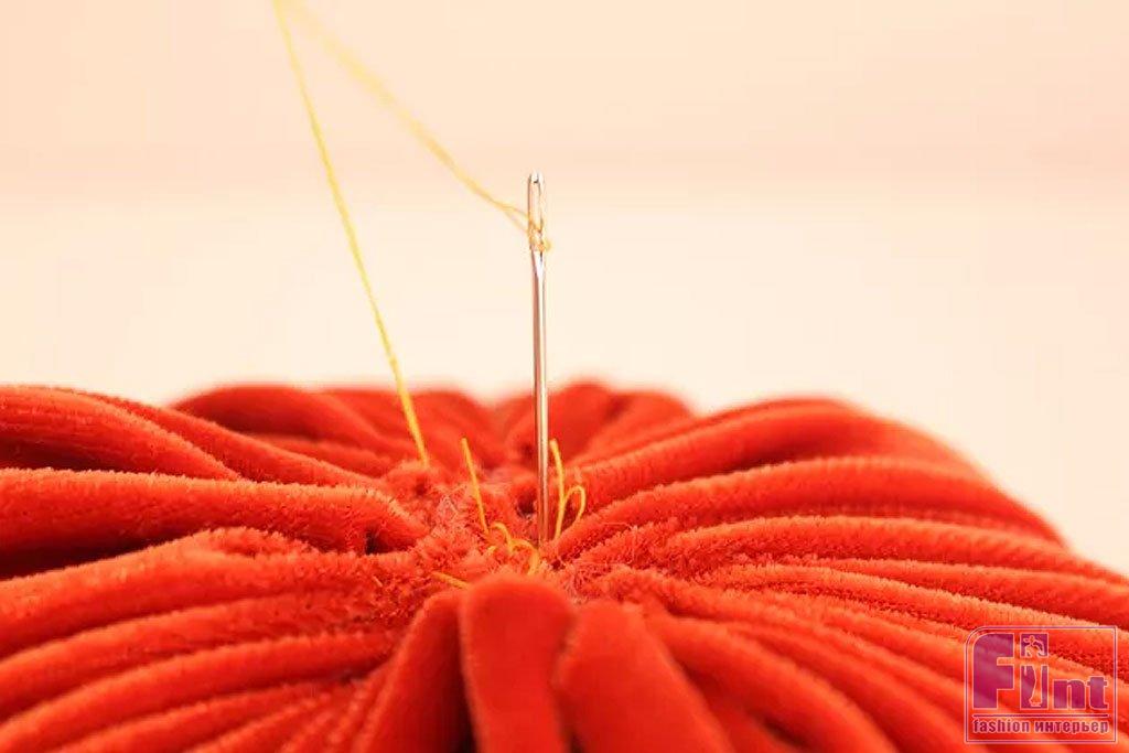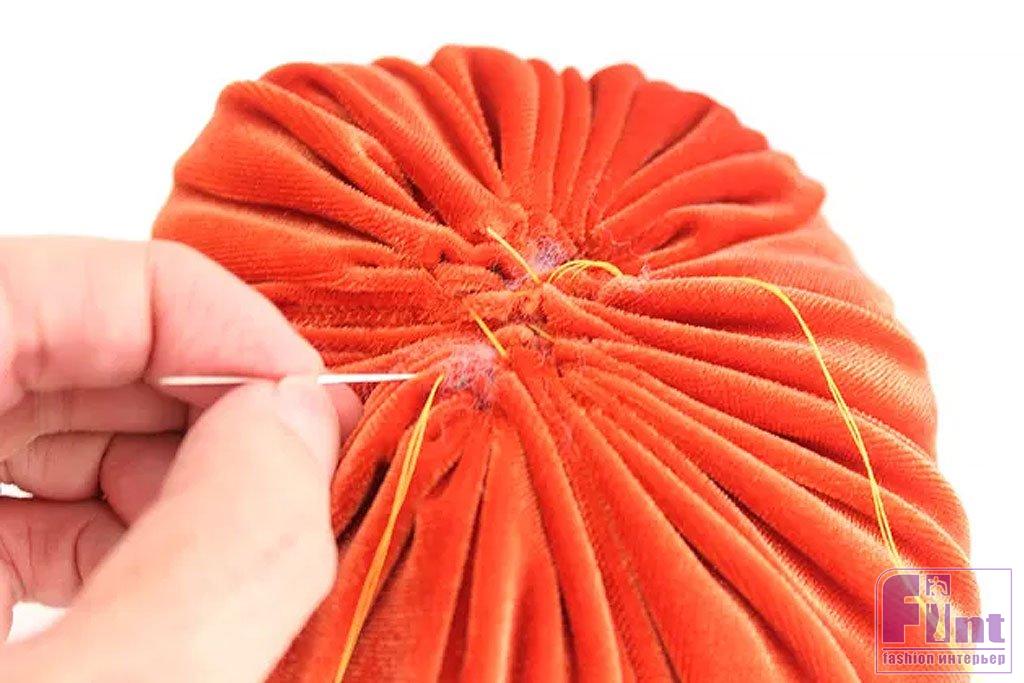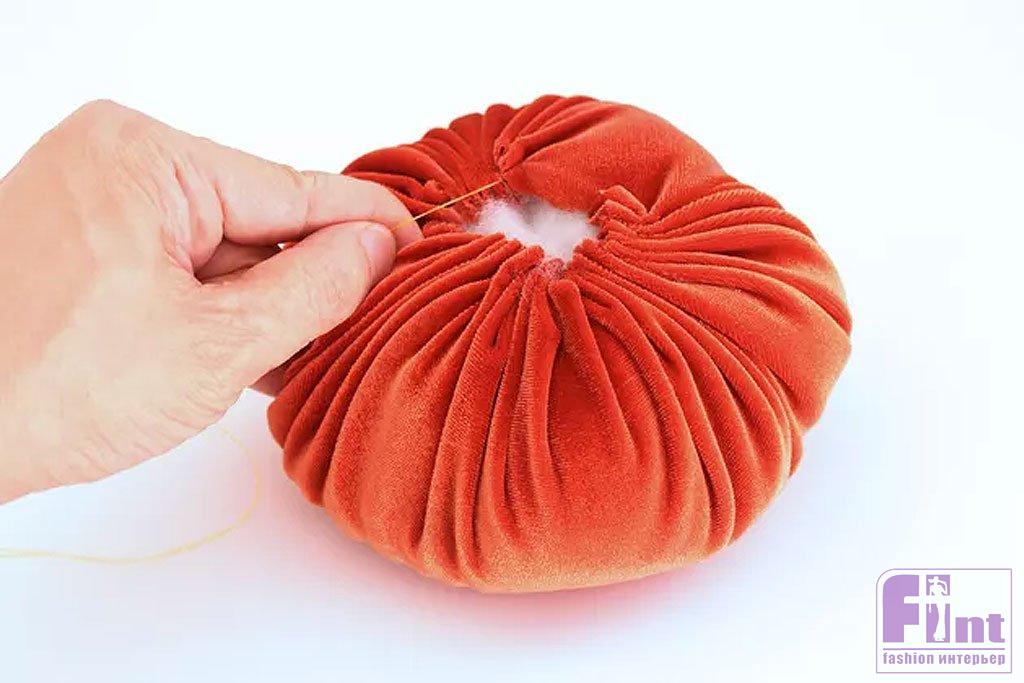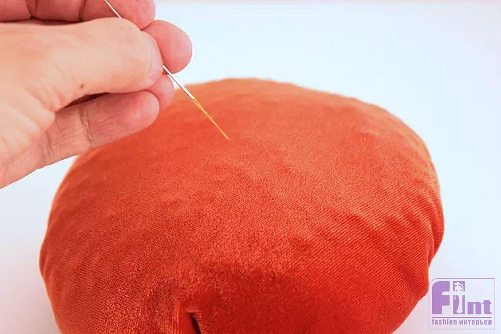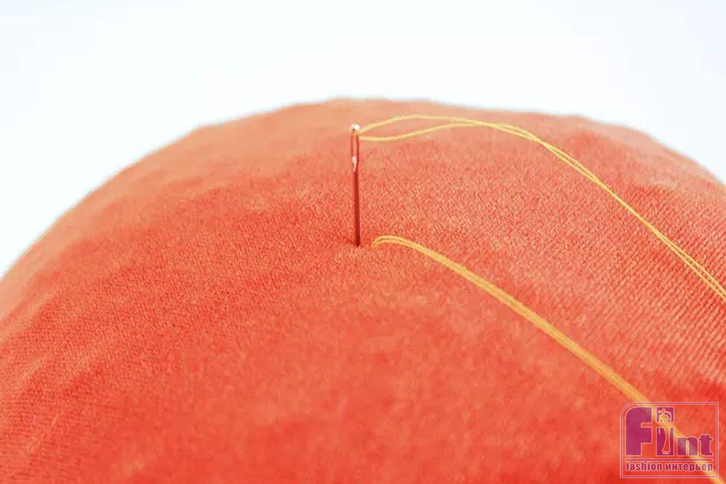 Естественно, ваша игла не будет такой длинной, как тыква, поэтому просто немного придавите тыкву, пока игла не выйдет с другой стороны. Вставьте иглу обратно в нижнюю часть тыквы, и пусть игла снова выйдет из вершины мешочка. Туго закрепите нитку наверху, и вы создадите на дне тыквы красивую ямочку.