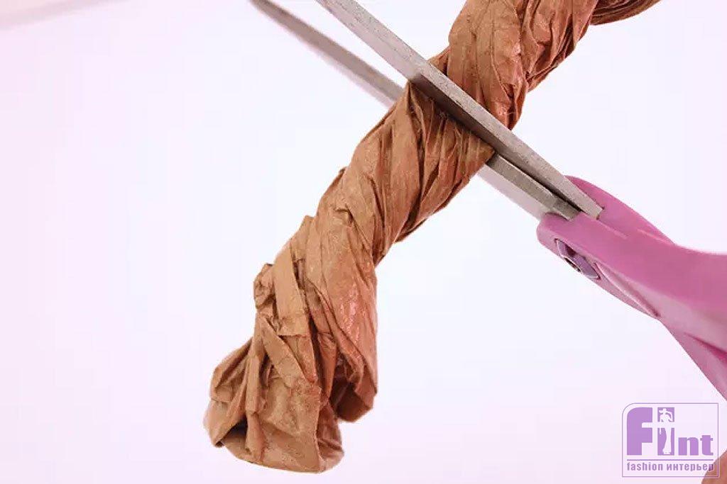 Чтобы добавить немного реалистичности стеблю, разорвите его по краю среза, чтобы создать «усики» и «веточки», торчащие в стороны и вверх. При необходимости нанесите еще один слой клей-лака, чтобы дополнительно «запечатать» бумагу.