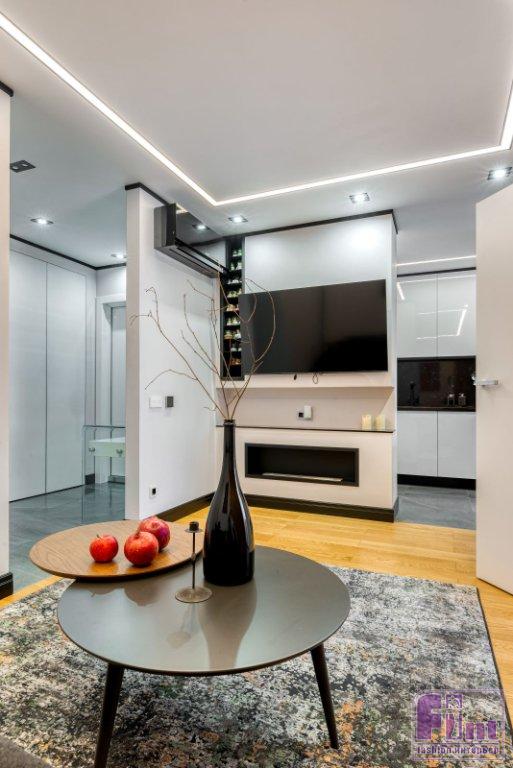 Помещение получилось необычной конфигурации, однако абсолютно функциональным и наполненным естественным светом из окна на кухне. В гостевой зоне разместились телевизор, биокамин, кофейный столик и раскладывающийся диван, выступающий дополнительным спальным местом в случае необходимости.