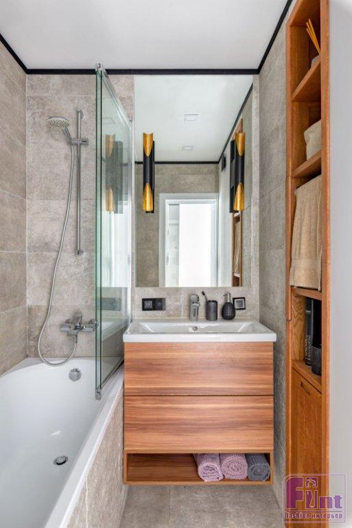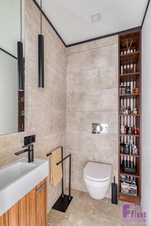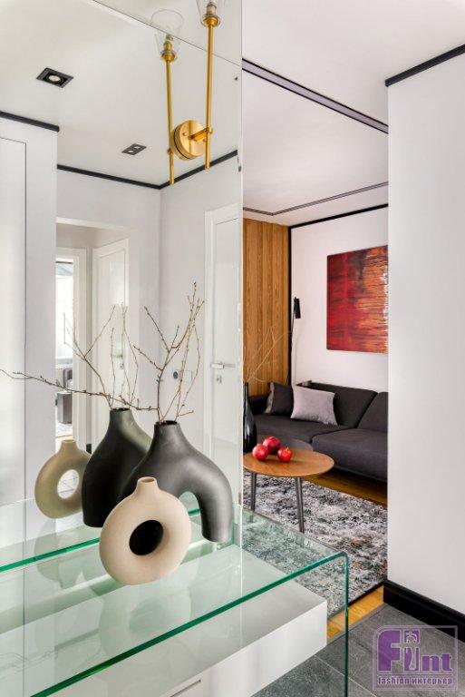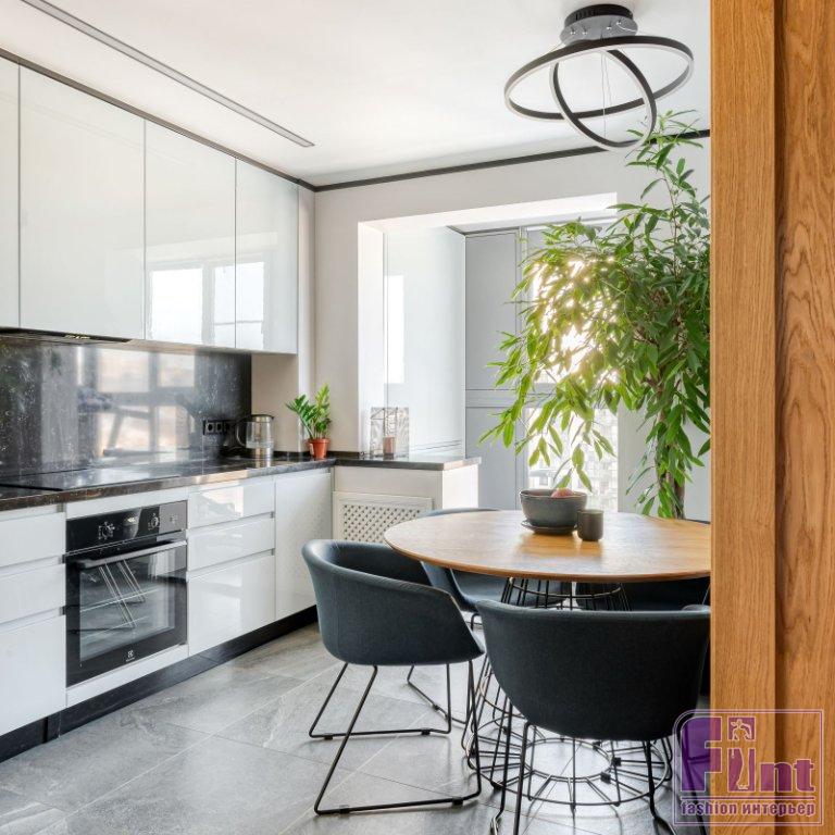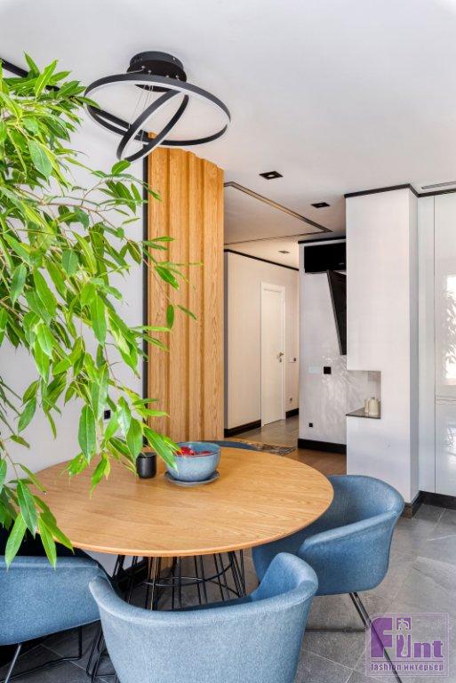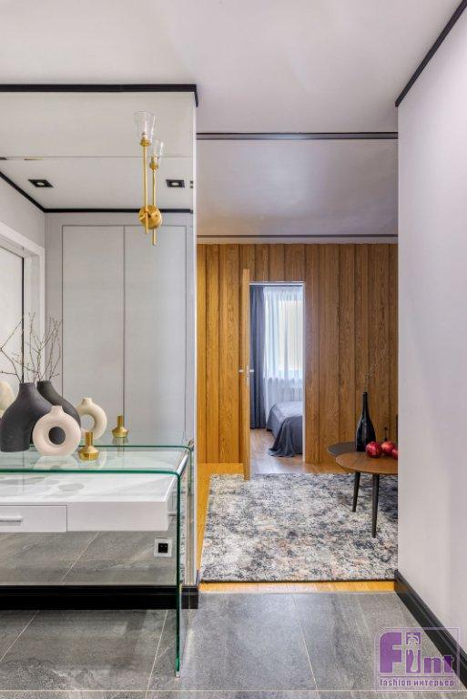 Монохромные цвета отделки и мебели в интерьере всей квартиры разбавлены контрастными чёрными линиями светильников, плинтусов и молдингов. А искусно вписанные в интерьер предметы из дерева натуральных оттенков привносят в современный дизайн ощущение уюта и домашнего тепла.