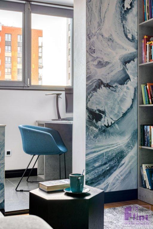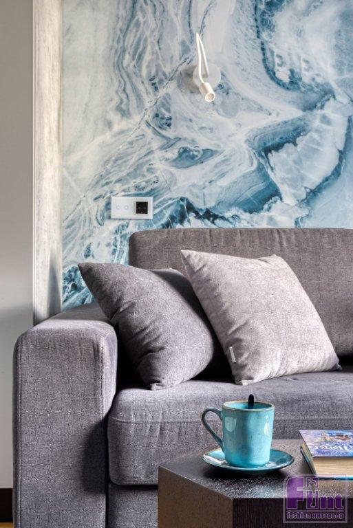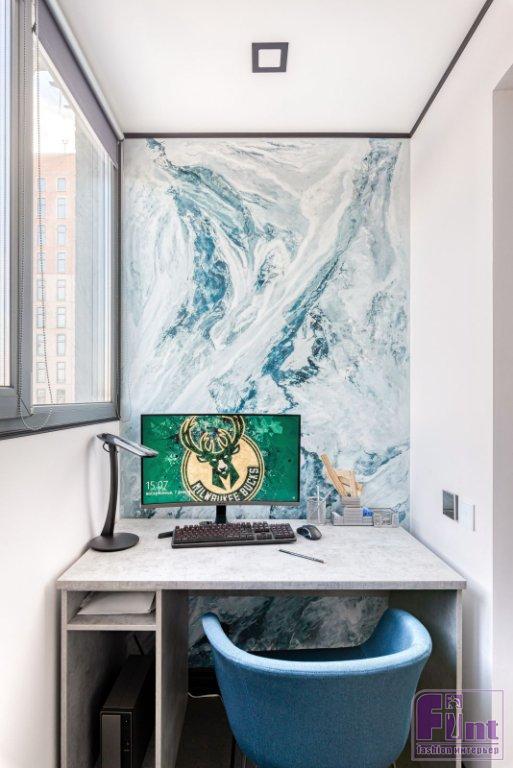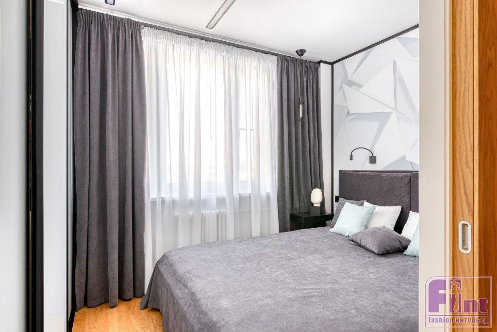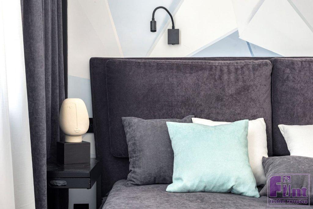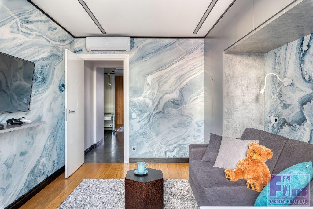 В проекте автор активно использовала современные фотообои на экологически чистой основе. Этими фотообоями отделана акцентная стена в хозяйской спальне и почти все поверхности в детской комнате. Для спальни дизайнер выбрала изображение в геометрической абстракции, а комната сына хозяйки квартиры оформлена фактурой серо-голубого мрамора.