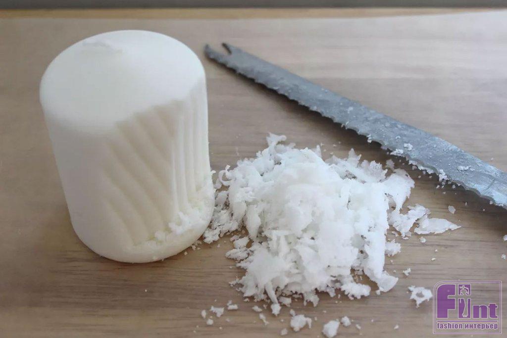 Для изготовления имитации ломтика лимона вам понадобится непрозрачный белый свечной воск, а не прозрачный гелевый воск. Самый простой способ получить немного белого воска настрогать его с боковой поверхности обычной белой свечки при помощи острого ножа. Убедитесь, что воск без запаха.