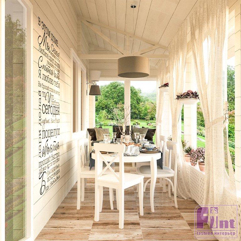 Часть комнаты – это гостиная с камином и уютным креслом. Другая часть – кухня, представляющая собой функциональное рабочее пространство со встроенной бытовой кухонной техникой. Из кухни можно сразу попасть на веранду, которая была задумана дизайнером как остеклённое помещение с очень низкими подоконниками и прекрасным видом. Здесь по проекту Натальи расположилась уютная столовая.