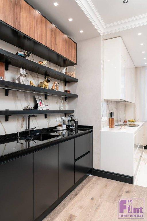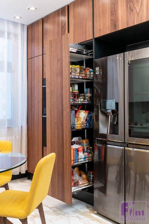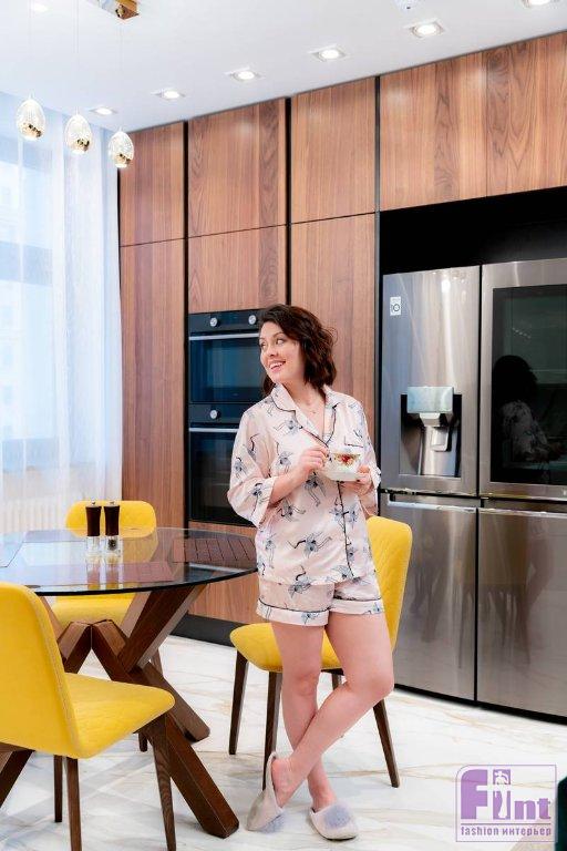 Первоначально актриса высказывала достаточно скромные пожелания: нужно было создать минималистскую кухню с акцентом на дерево. Шпон для фасадов выбирали очень тщательно, потому что от его цвета и фактуры зависел подбор всех остальных оттенков, которые использовались в проекте. Дерево планировали разбавить белым глянцем, но «американский орех» задал иное настроение. Так появились фасады элегантной графитовой окраски. Они удачно подчеркнули тёплый цвет шпона. Чтобы не утяжелять пространство, часть кухни оставили белой, как и хотели вначале.