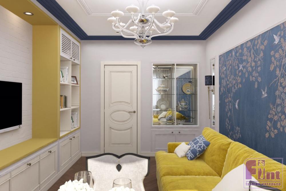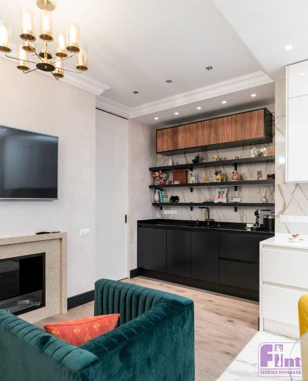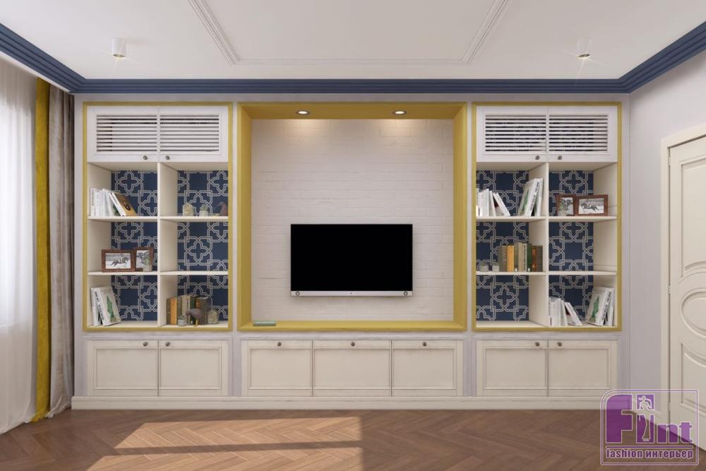Интерьер гостиной в квартире Марии Кравченко ближе всего к неоклассике со свойственными ей симметричностью и презентабельностью. Но благодаря имитации кирпичной кладки, использованной в отделке ТВ-зоны, помещение приобрело лофтовые мотивы. Система кондиционирования встроена в нишу и спрятана за легкими решётчатыми дверцами, что делает её незаметной. Дизайн-проектом предусматривается обустройство в ТВ-области множества полочек и шкафчиков для мелочей.