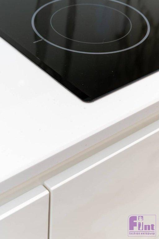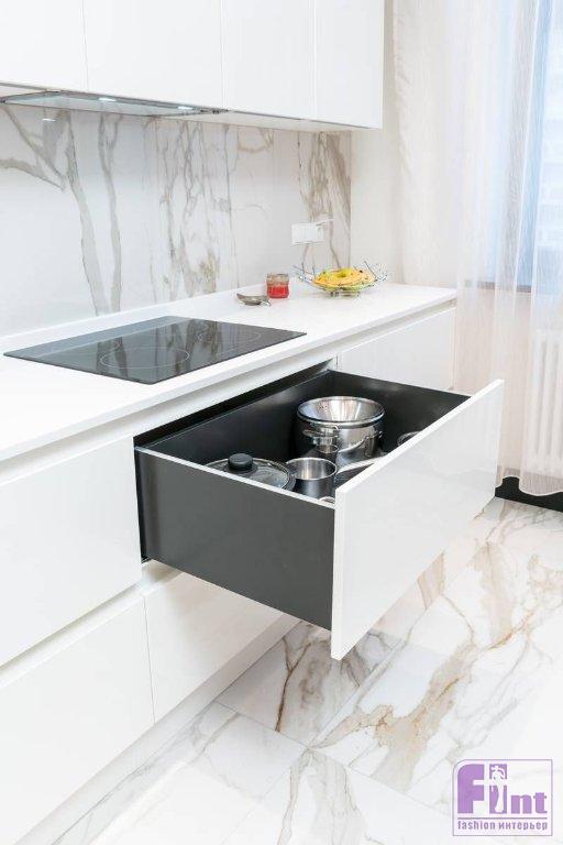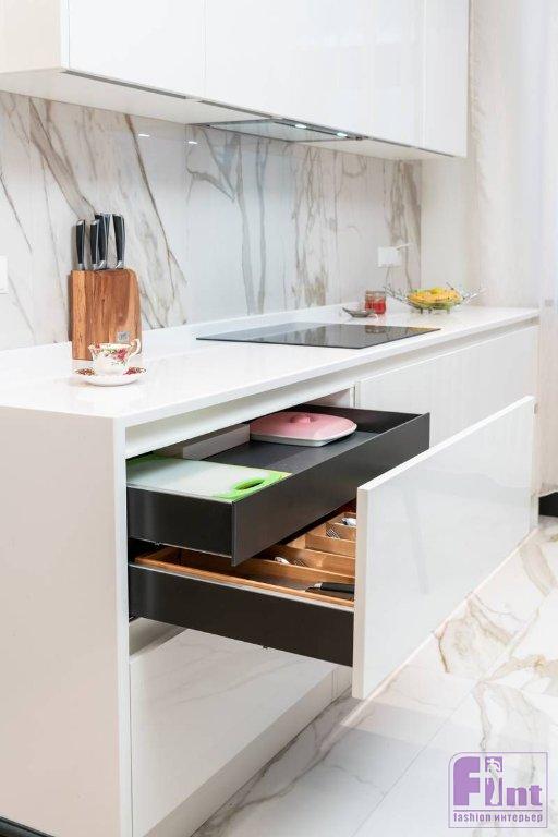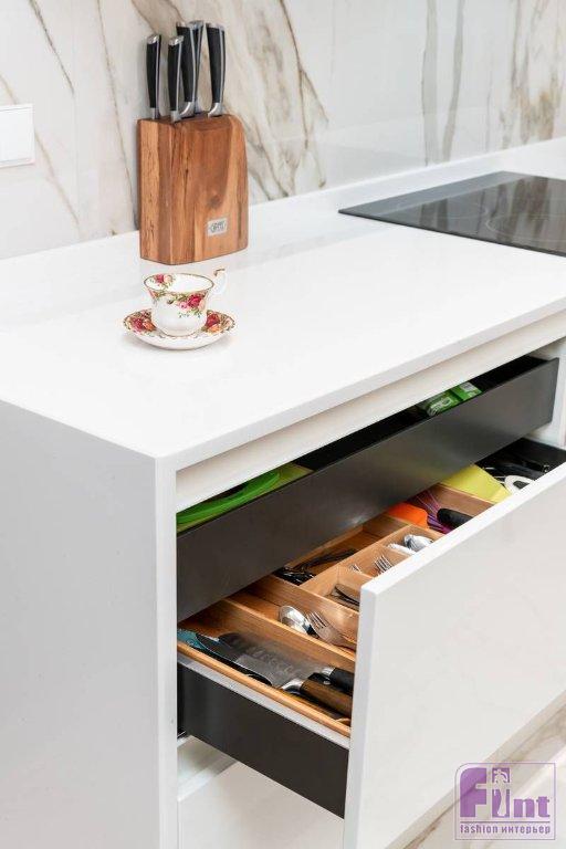 Функционально кухню разделили на три зоны. Системы хранения продуктов и посуды, а также встраиваемую технику разместили в шпонированных колоннах. Зону приготовления пищи с варочной панелью оборудовали в белой части кухни, «мокрую» зону с мойкой – в графитовой.