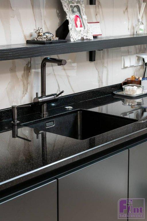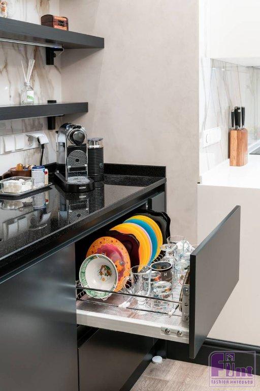 «Кайф такой, что из дома выходить не хочется, – признаётся Мария Кравченко. – Как хорошо, что в наше время не приходится выбирать между красотой и удобством. В моей кухне мне нравится всё: и сочетание цветов и фактур, и её функциональность. Выверен каждый миллиметр. От прорисовки проекта до производства и установки – всё сделано стильно и грамотно. Я люблю готовить и тщательно слежу за частотой питания, порциями, калорийностью. Встаю в 06:30, собираю и отвожу ребёнка в садик, потом встаю к плите и готовлю еду на всех: мужу одно, себе другое. Собираю контейнеры, и уже готова стартовать по делам с полной сумочкой еды – домашней, вкусной, правильной!»
