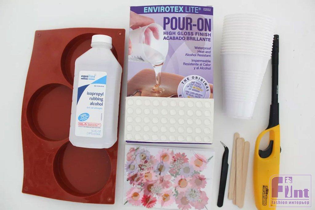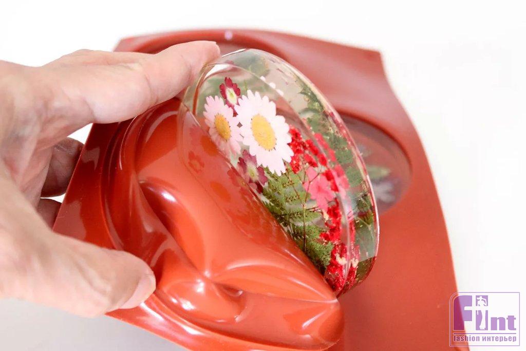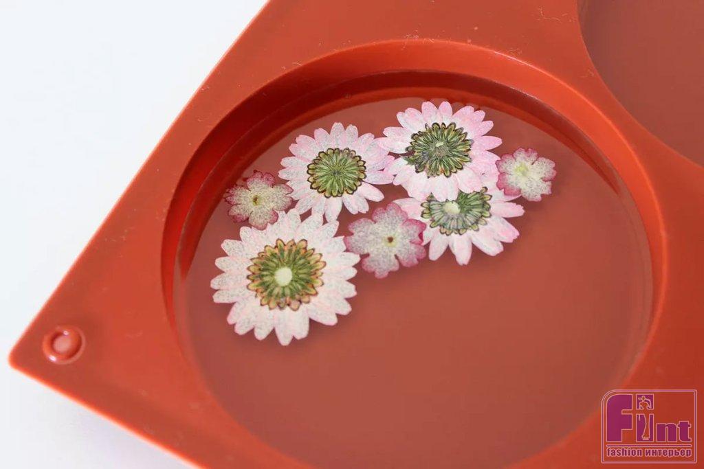 Располагайте цветы «вверх ногами» в смоле, так как нижняя часть формы на самом деле будет верхней частью подставки.