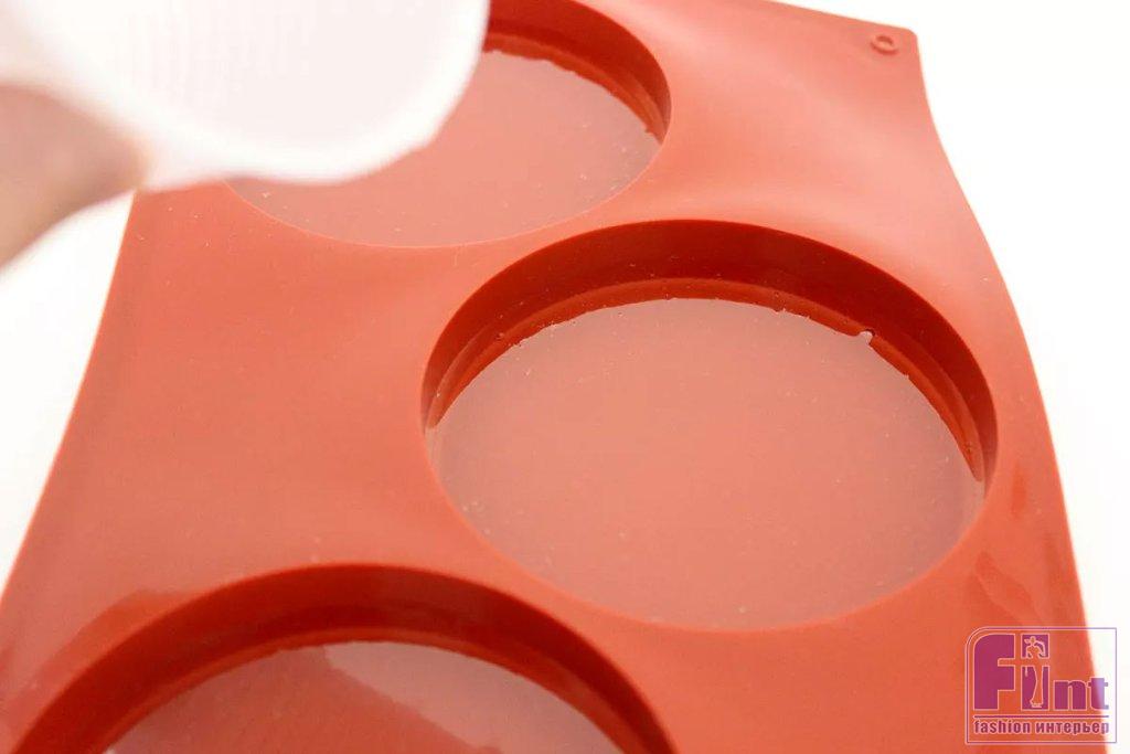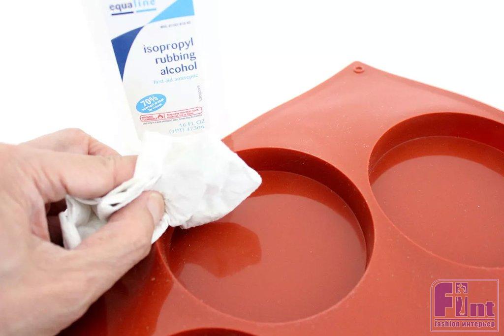 Для этого проекта вам понадобится силиконовая форма с круглыми ячейками диаметром около 10 см. Хорошенько вымойте её водой с мылом и дайте полностью высохнуть. Затем удалите все остатки влаги бумажным полотенцем и обработайте форму спиртом.