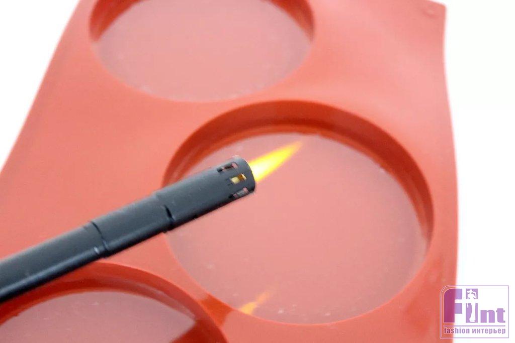 Пузырьки воздуха, образующиеся при смешивании, будут заметны в смоле, а в форме начнет образовываться ещё больше пузырьков. Чтобы удалить пузырьки, проведите пламенем газовой зажигалки примерно в пяти сантиметрах над поверхностью смолы. Углекислый газ, выделяющийся при горении, поможет избавиться от этих пузырьков. Даже после того, как вы удалите пузырьки, в первые 15 минут они снова могут появиться, поэтому будьте бдительны и повторяйте работу с зажигалкой по мере их образования.