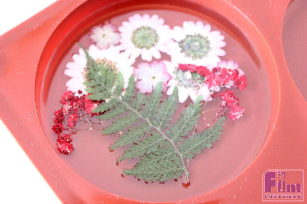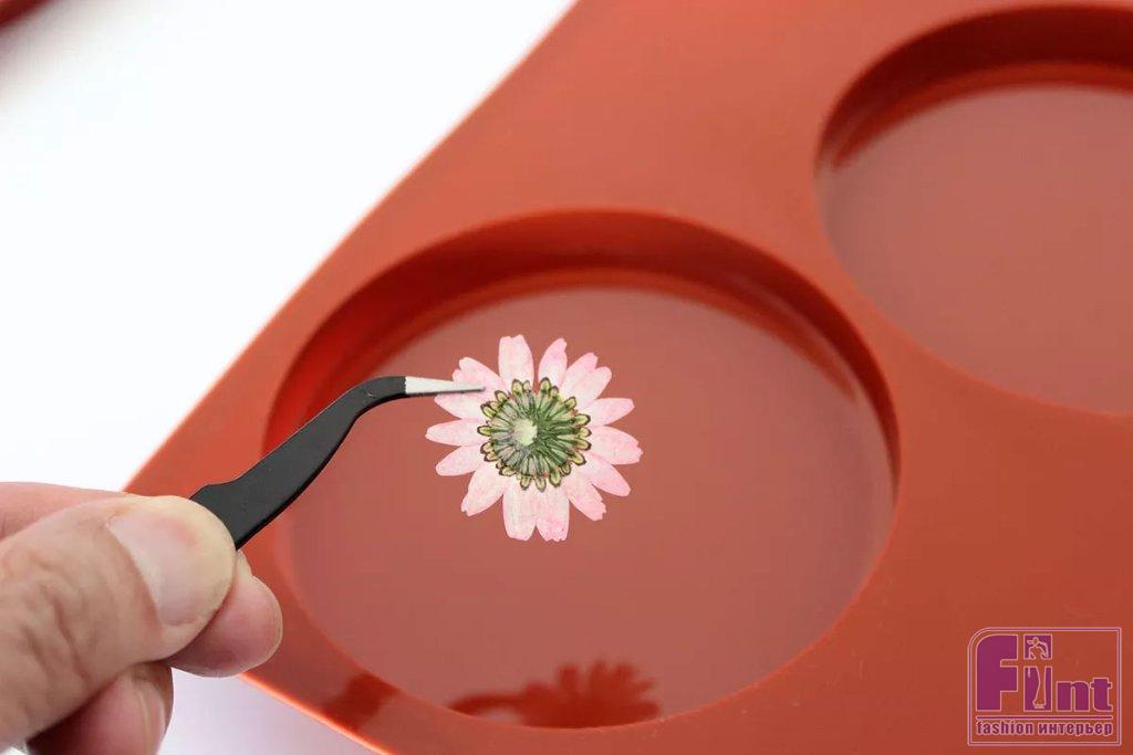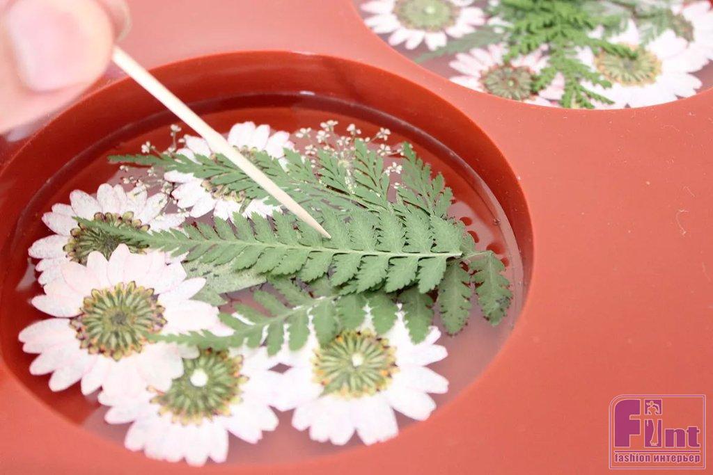 После того как смола простояла в форме около 15 минут, пришло время добавить цветы и листья. Пытаться манипулировать нежными прессованными цветами пальцами может быть сложно, поэтому укладывайте их по отдельности небольшим пинцетом.