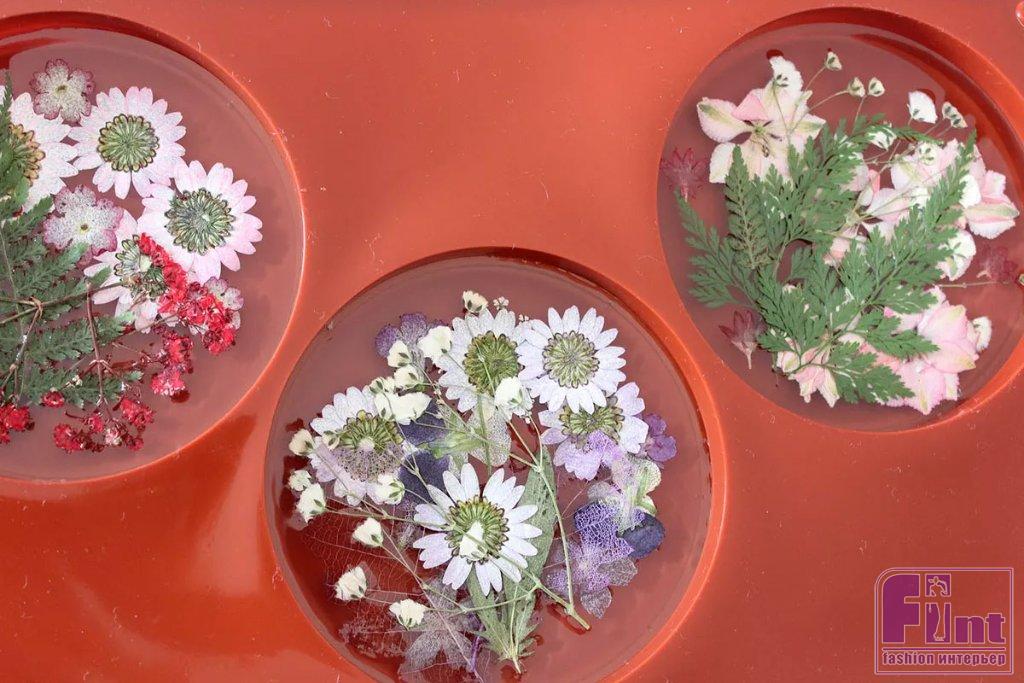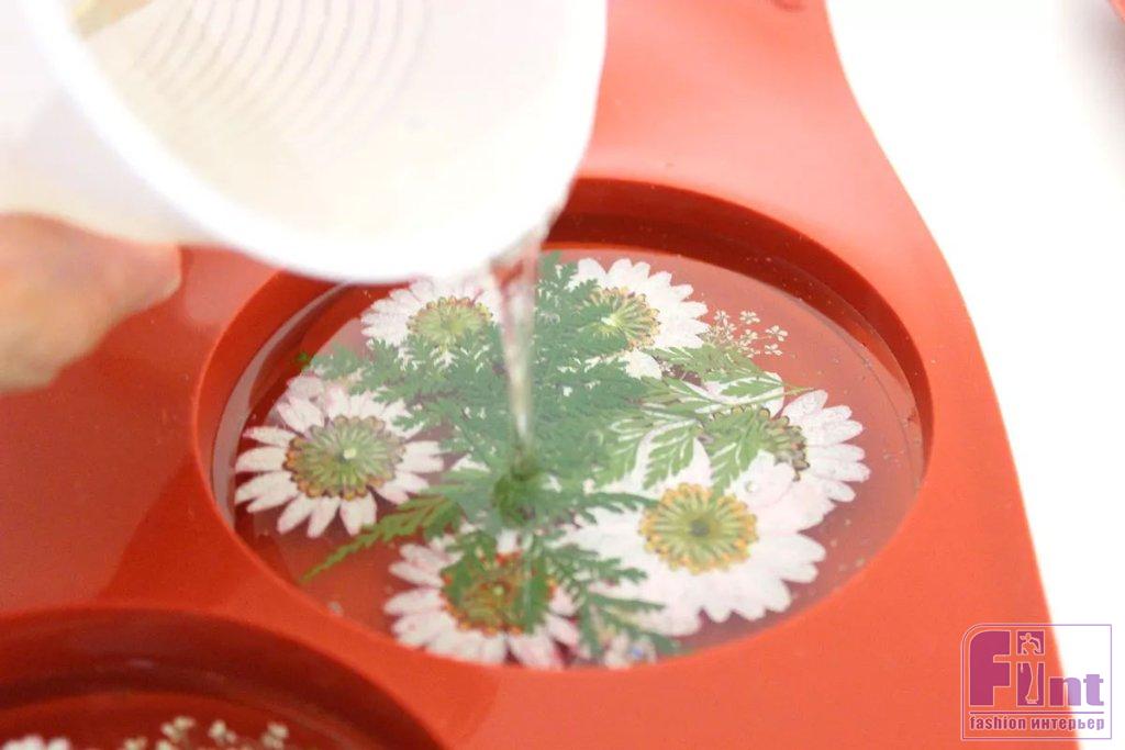 Смешайте ещё одну порцию смолы, как вы делали это раньше. Вылейте смолу в формы поверх первого слоя с цветами. Вам не нужно заливать смолу до самого верха формы – достаточно, чтобы полностью закрыть уложенные цветы.
