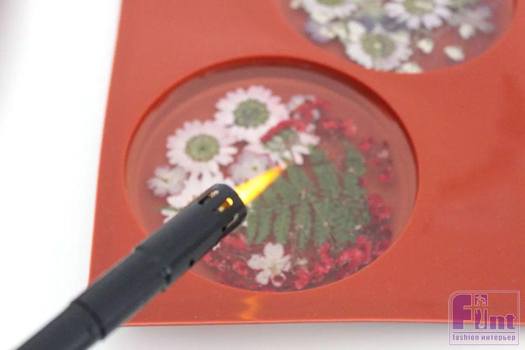 Удалите все пузырьки, которые образуются во втором слое смолы, с помощью газовой зажигалки.