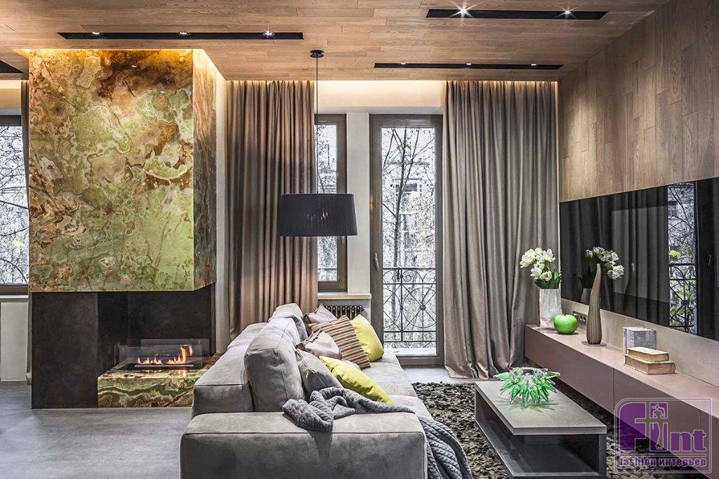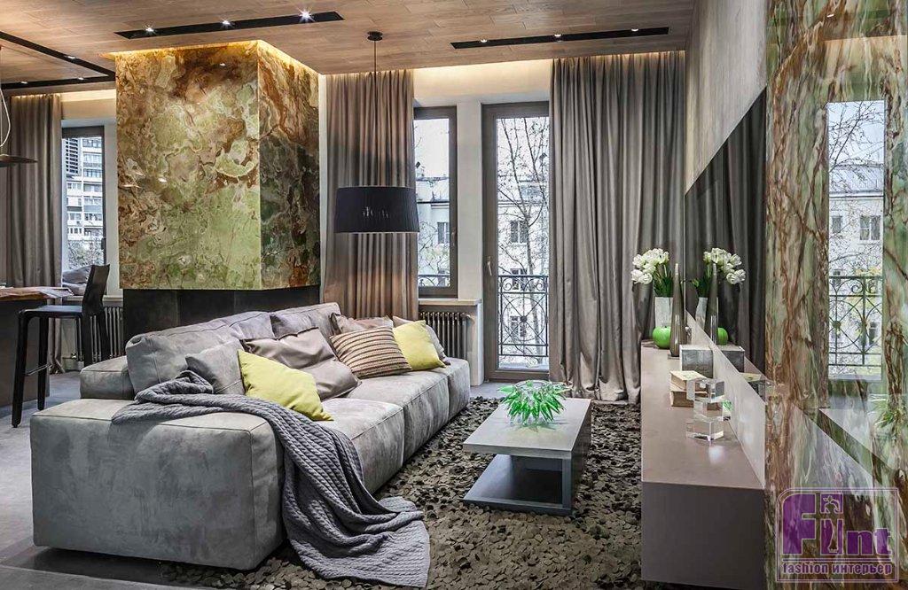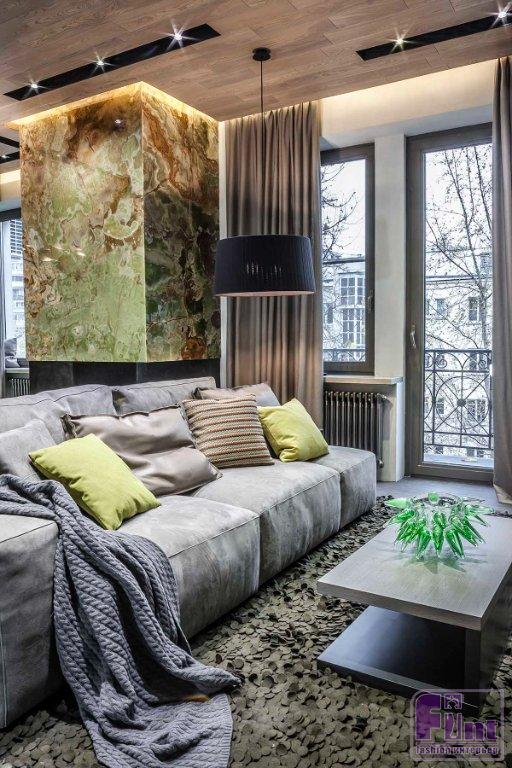Отправной точкой в дизайне стал, как это не прозвучит странным, мусоропровод, который находился в шестиметровой кухне. Именно мусоропровод трансформировался в итоге в ключевой акцент и самый стильный предмет интерьера в квартире Владимира Стеклова. Мусоропровод переделали в оригинальный современный камин, работающий на жидком биотопливе растительного происхождения, и облицевали каминный портал натуральным ониксом. Теперь тихими зимними вечерами Владимир Стеклов может отдыхать от напряжённого рабочего дня, наблюдая за настоящим живым огнём в тихой спокойной обстановке. В зоне отдыха на пол положили эффектный ковёр, напоминающий морскую гальку, и установили новые чугунные радиаторы отопления из ретроколлекции.