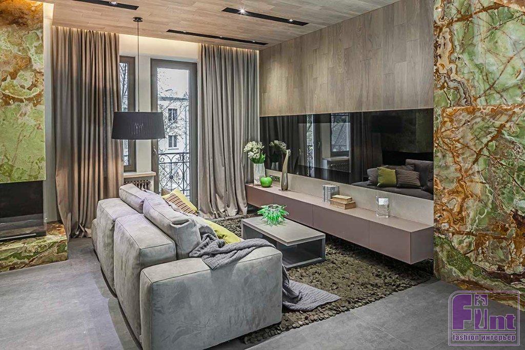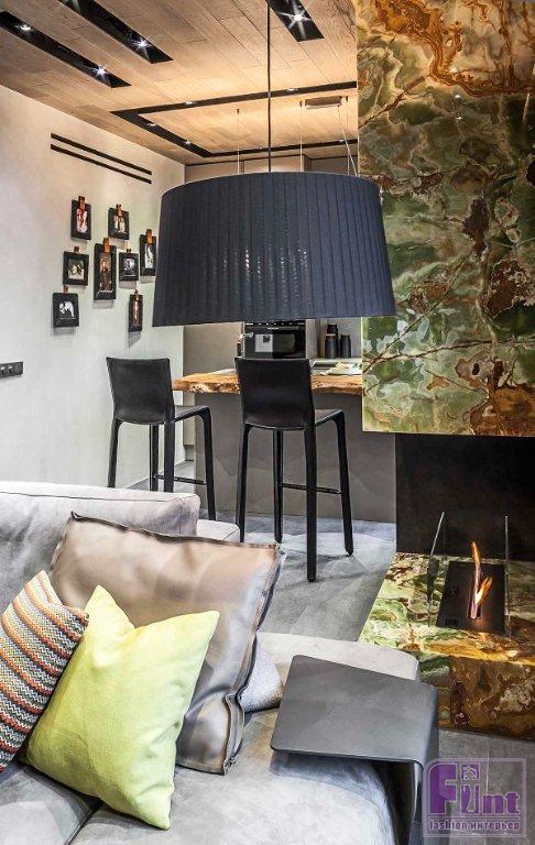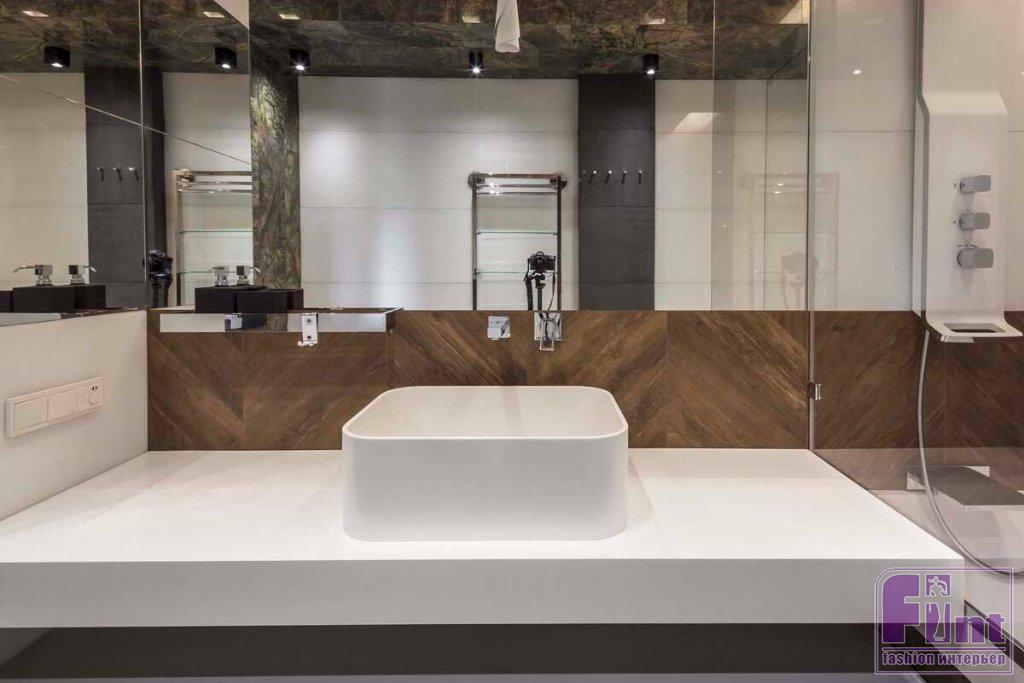 Для стен выбрали декоративную штукатурку из микроцемента, которая является прекрасным аналогом дорогому кафелю. Дополнительно для отделки стен использовали бетон и натуральный камень оникс. Для облицовки пола применили современный аналог керамической плитки – керлит толщиной 6 мм.