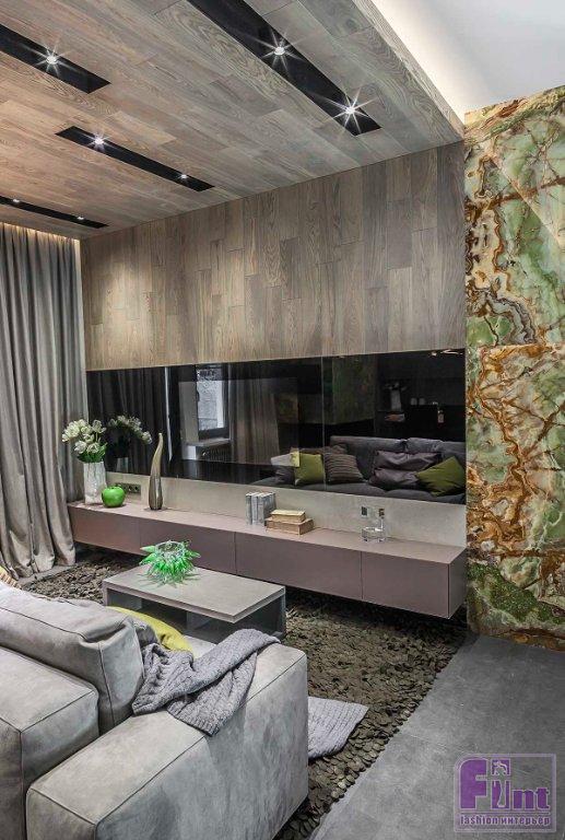 Затем строители соорудили на потолке каркас из металлического профиля и обшили его дубовым паркетом. Это современное дизайнерское решение сегодня набирает большую популярность среди заказчиков. Древесину пропитали защитным составом с эффектом естественного старения.