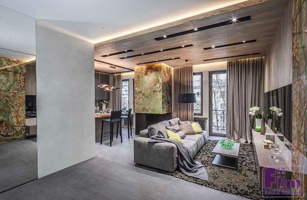 Двери санузла демонтировали, новую перегородку установили ближе к прихожей. Благодаря такому решению площадь кухни увеличилась. От гостиной её отделяет стильный кухонный остров со столешницей из искусственного камня, изготовленный на металлическом каркасе. Он довольно функционален, поскольку наполнен большим количеством ящичков и полочек для хранения.
