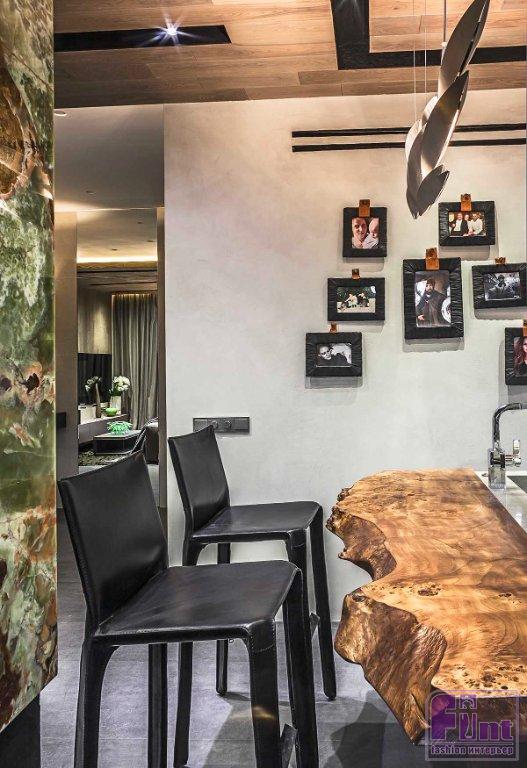 Барную стойку освещает необычная люстра, напоминающая плавающих рыб. Дизайнер своими руками сделала рамки для памятных фотографий актёра. В работе она использовала оригинальные гвозди из металла, изготовленные вручную в кузнице.