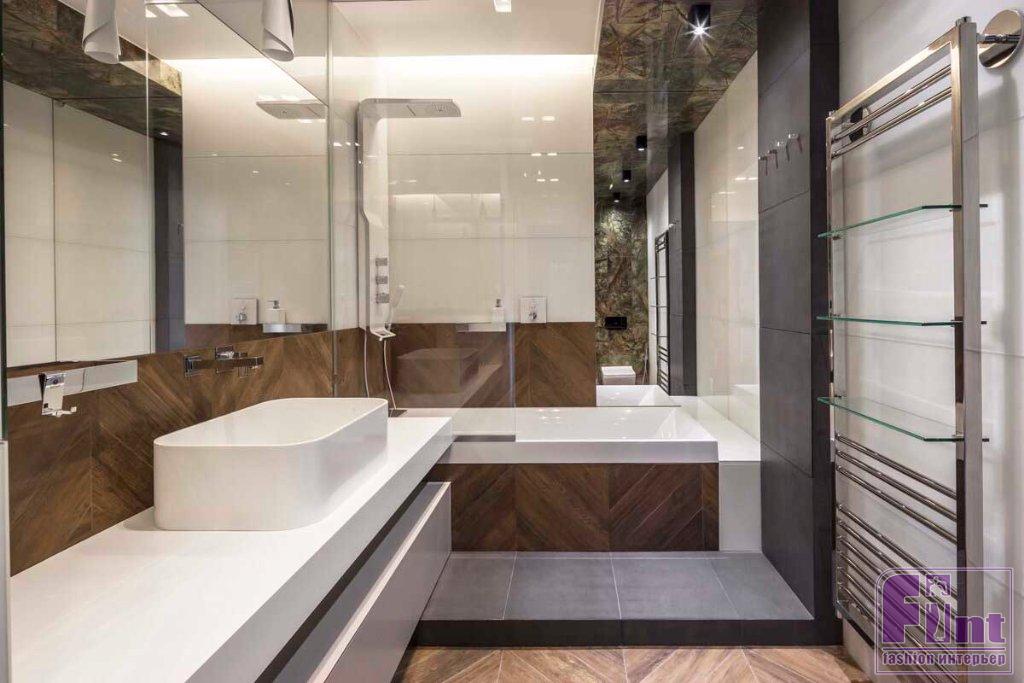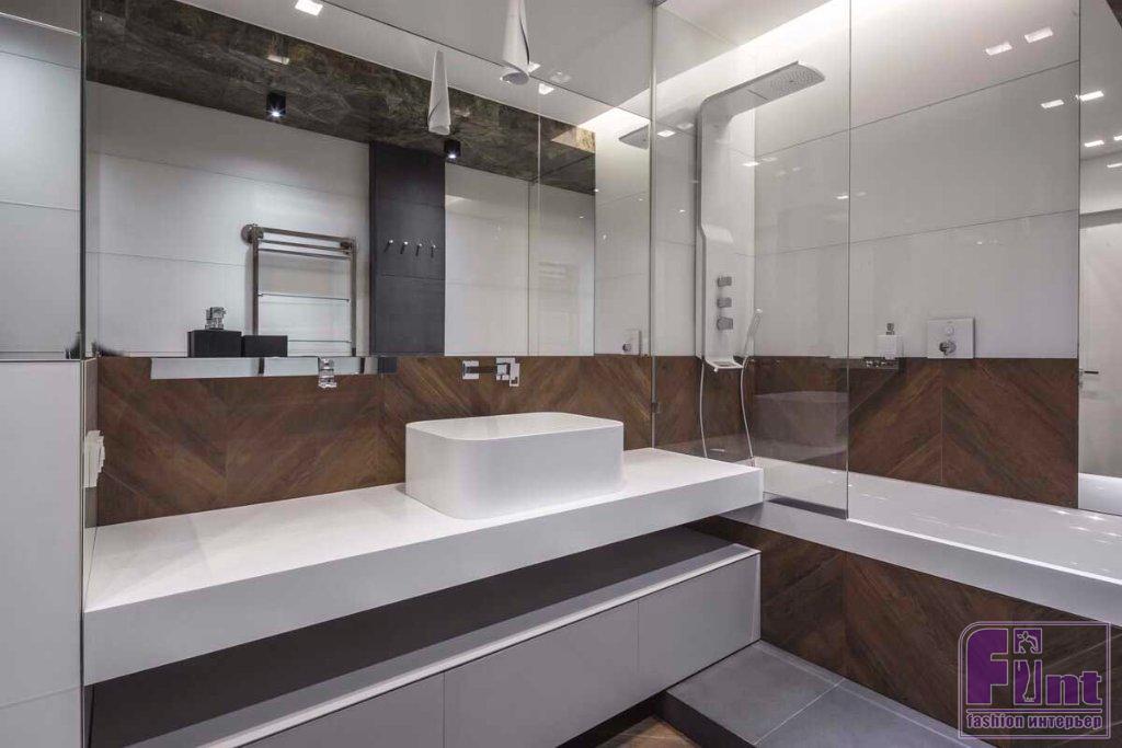 Для стен ванной комнаты выбрали инновационное современное покрытие – окрашенное стекло. Это довольно практичный вариант, хотя его редко используют в интерьерах. Дополнили обстановку зеркальные панели, установленные не только над раковиной, но и вдоль стен.