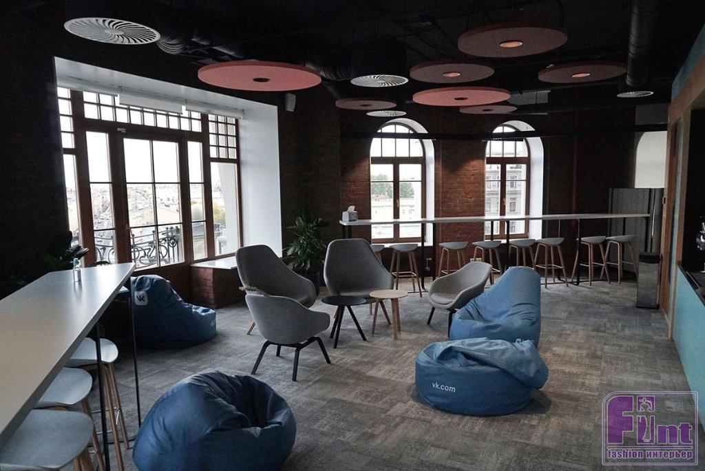 Современное звучание интерьеру придал и лаконичный дизайн мебели, отметили авторы проекта. Для нового офиса компании «Вконтакте» были, в частности, использованы бескаркасные кресла, которые в народе называют кресло-мешок, или bean-bag (в переводе «мешок фасоли»). Кресла были изготовлены на заказ из очень прочной ткани с нанесённым на неё логотипом Вконтакте. Также в отделке старались использовать наиболее актуальные для сегодняшнего времени интерьерные цвета – оттенки серого, бирюзового, кораллового и синего (фирменного для «ВКонтакте» цвета).