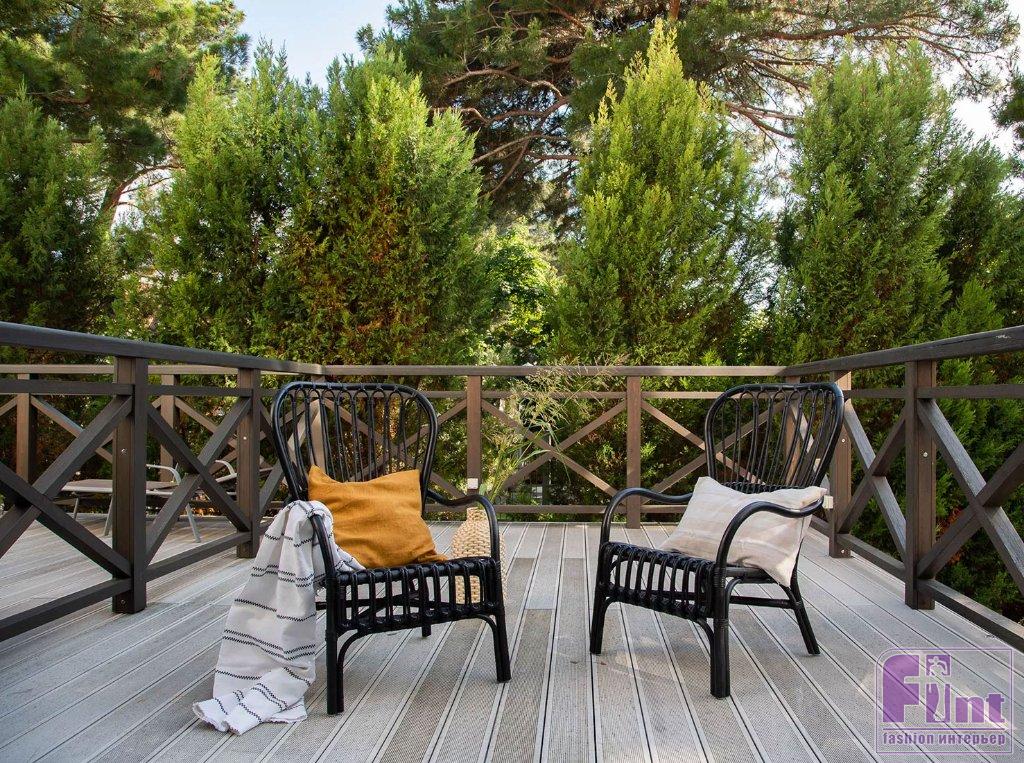 Стены и потолок гостиной выкрашены в чистый белый цвет, но с тёплым цветом пола они приобрели более интересный и сложный оттенок. Спальню перекрасили в серый тон, который создает обволакивающую атмосферу уюта и покоя. Мебель подбирали практичную с учетом сдачи в аренду — диваны раскладываются, стулья можно вынести на террасу, поскольку они защищены от атмосферных и температурных воздействий. На кухне отказались от верхних шкафов и духовки, так как на отдыхе не предполагается активное приготовление пищи в домашних условиях.