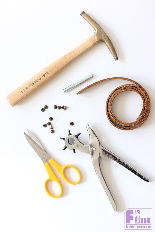 Теперь можно заняться ручками. Пробейте отверстия с каждой стороны кожаных ремней с помощью дырокола для кожи или ручного пробойника. Поместите заклёпку внутрь проделанного отверстия, приложите ремень к корзине и просуньте «ножку» заклёпки между верхних рядов верёвки. Мы поместили ручки между предпоследним и предшествующим ему витками. Используя молоток и что-то тяжёлое в роли «наковальни» расклепайте заклёпку с обратной стороны. Если у вас есть приспособление для закрепления заклёпок, прикрепить ручки будет ещё проще и быстрее. Убедитесь, что заклёпка надежно закреплена. Возможно, вам потребуется добавить дополнительный горячий клей в том месте, где заклепка прошла между витками верёвки.