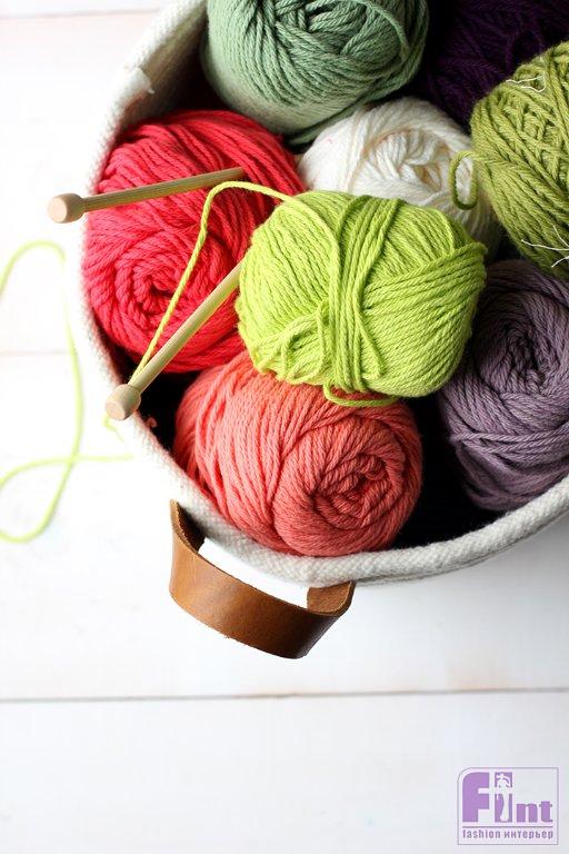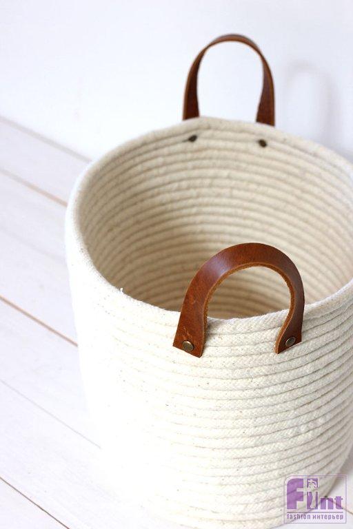 Традиционно веревочные корзины изготавливаются с помощью швейной машинки, на которой витки верёвки сшиваются между собой зигзагообразным швом. Но мы предлагаем вам совсем простой метод, при котором вам не потребуется швейная машинка и навыки швеи. Наверняка вы уже догадались, что основным инструментом для изготовления этой корзины своими руками станет незаменимый в любом творчестве клеевой пистолет. Конечно же, использование клеевого пистолета не делает корзину столь же прочной, как швейная машинка. Но наша корзина будет достаточно прочной, чтобы хранить в ней свои вязальные проекты, мягкие игрушки или домашний текстиль. Дополнительного шарма нашей корзине придадут стильные кожаные ручки.