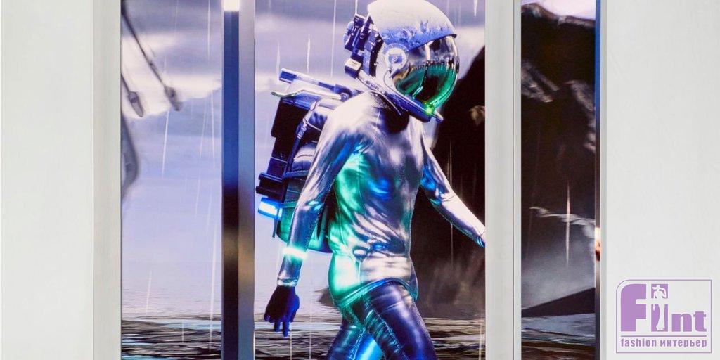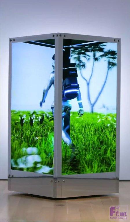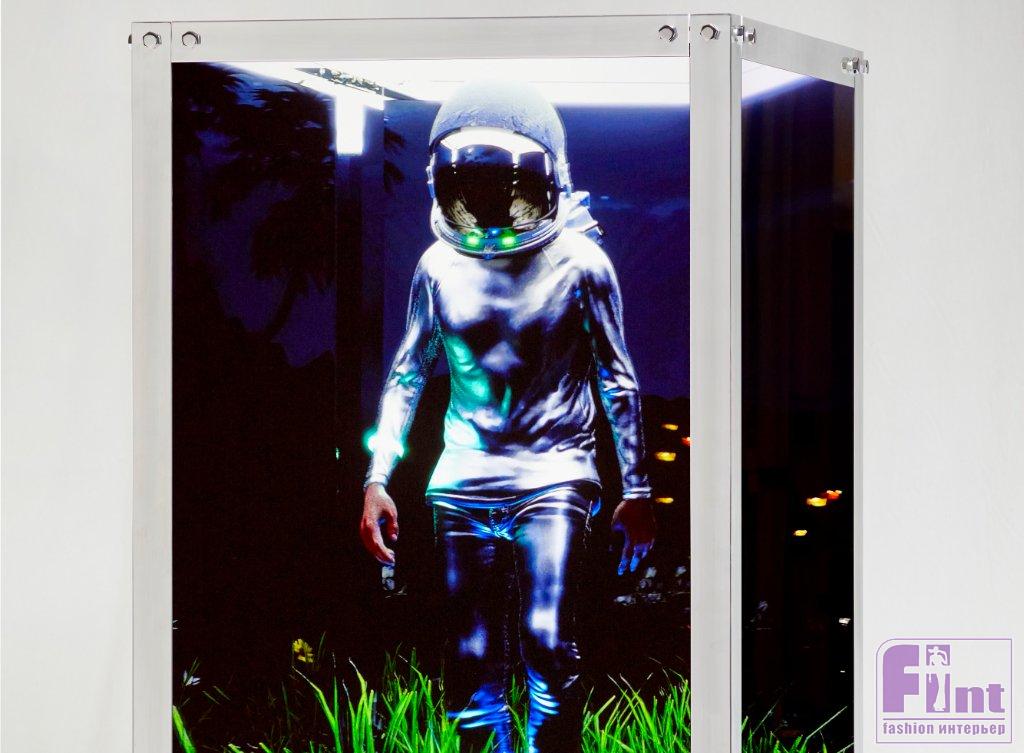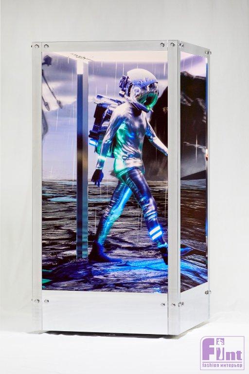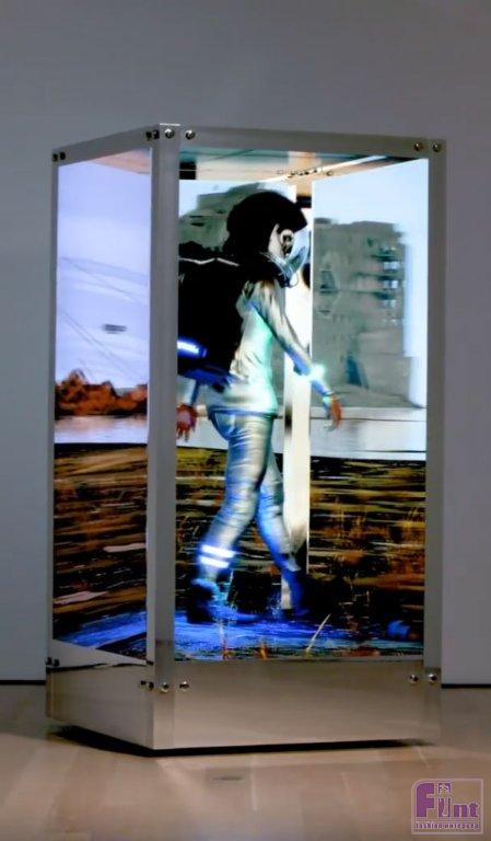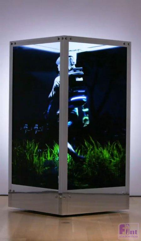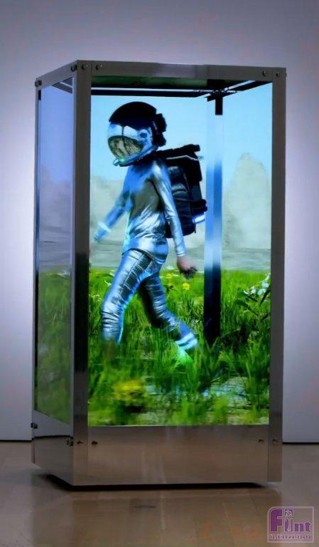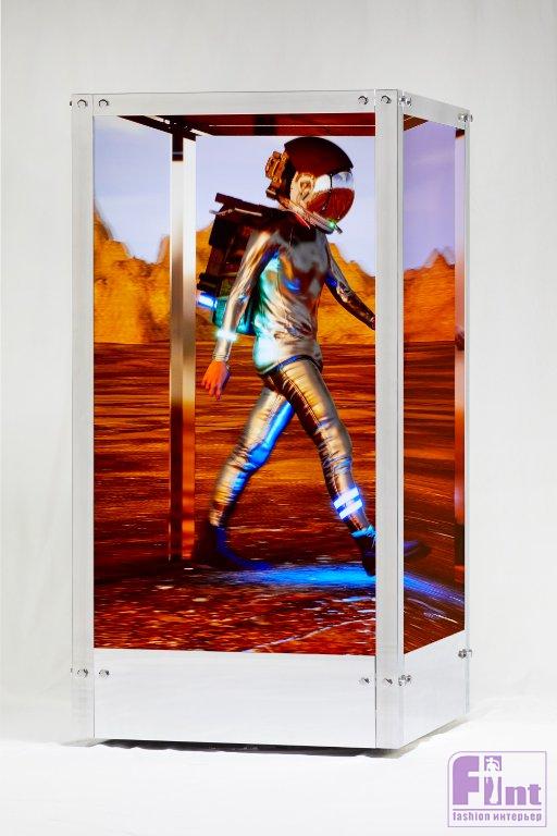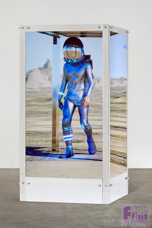 Монолитная светодиодная скульптура по своей форме напоминает прозрачную клетку фокусника, стенами которой служат четыре соединенных между собой видеоэкрана. В действие их приводят встроенные в основание скульптуры компьютеры. На самих экранах отображается постоянно меняющийся антиутопический пейзаж, по которому ритмично шагает похожий на космонавта анонимный герой в шлеме.