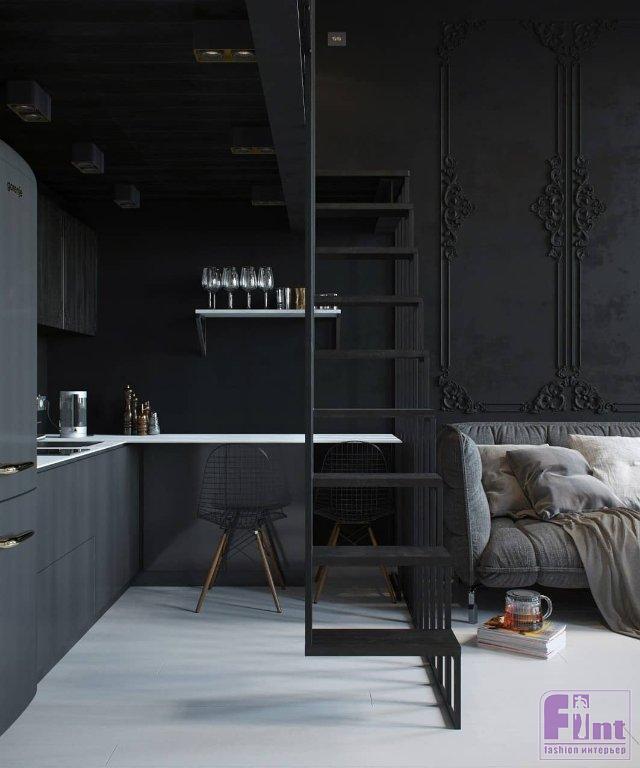 Если для повседневной радости женщине бывает достаточно маленького чёрного платья, то для гармоничного мироощущения ей просто необходима маленькая чёрная квартира. Так решила юная владелица 24-метровой студии во Владивостоке, попросившая дизайнера сделать интерьер максимально радикальным. О том, что из этого вышло, рассказывает наша фотогалерея и краткий отчёт о реализации этого необычного дизайн-проекта.