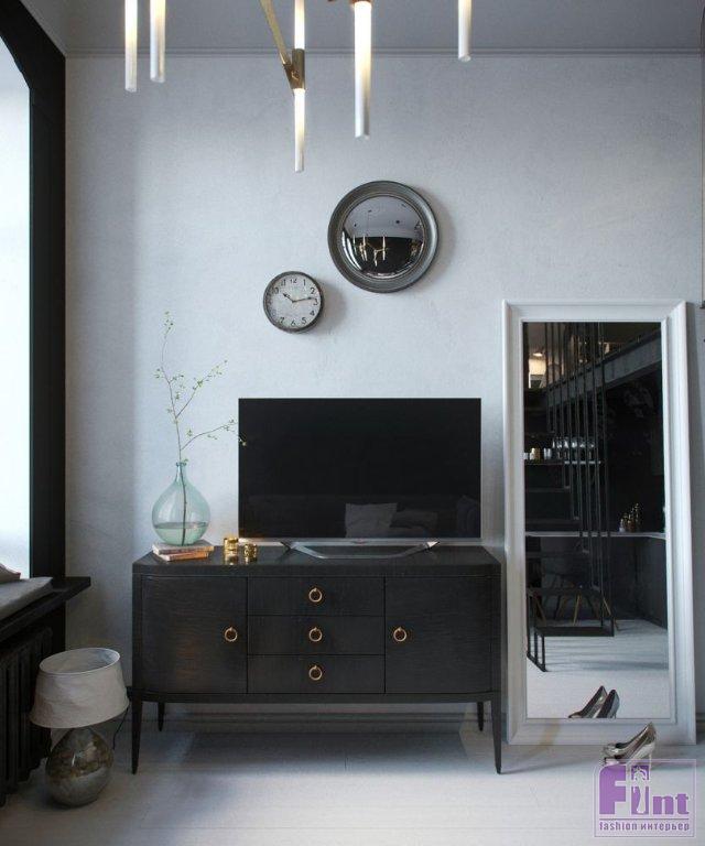 Получив в своё распоряжение совсем небольшую площадь, Татьяна Шишкина в первую очередь обратила внимание на высокие потолки. 3,8 м – именно такой была высота – позволили увеличить количество «квадратов» за счёт второго уровня. Обустроив его, Татьяна добилась того, что крохотное жилище превратилось в полноценную квартиру с гостиной, кухней, санузлом, спальней, гардеробной и маленьким кабинетом. Зоны получились небольшого размера, однако они вполне подходят для жизни одной миниатюрной девушки.