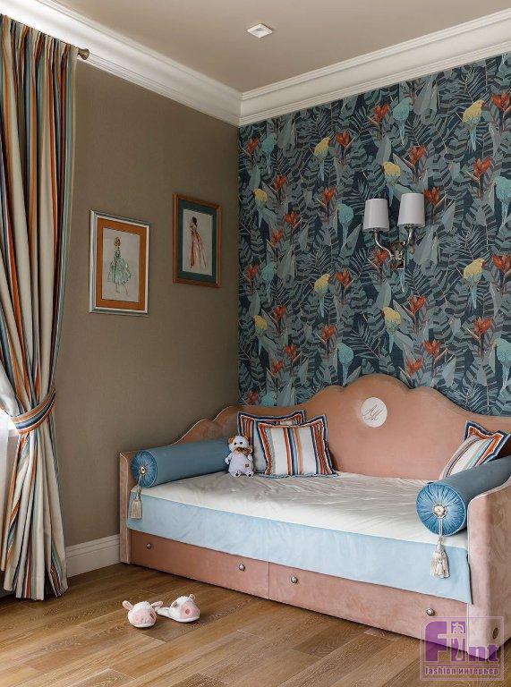 В проекте детской, изображенной на фото, все оттенки рисунка с акцентной стены отражены в шторах. А ещё они дублируются в декоре и другом текстиле по всей комнате. Смотрится всё это очень живо и органично.