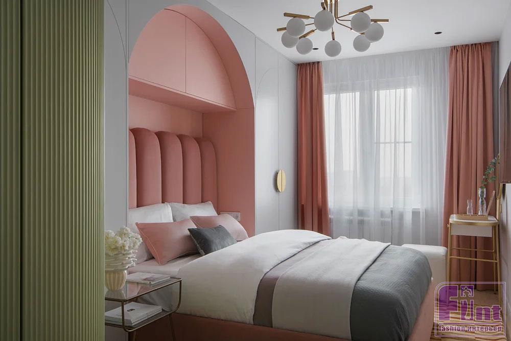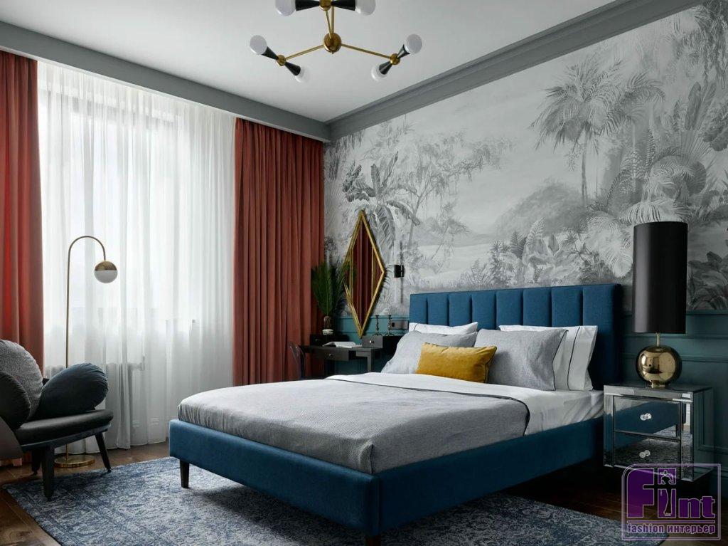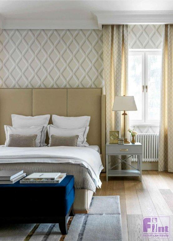 Кстати, можно продублировать не только цвет, но и сам узор. В этой спальне очень чётко прослеживается такой приём, и рисунок со стен плавно перетекает на окна. Стоит отметить, что масштаб узора заметно отличается, иначе всё слилось бы в одно большое пятно.
