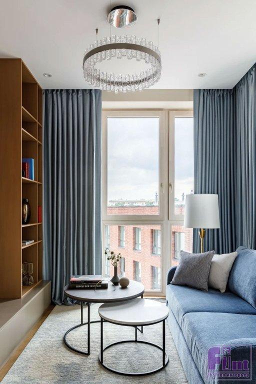 Один из самых простых, понятных и распространенных приёмов – шторы и стены одного цвета. Это должны быть однотонные обои без рисунка, обои под покраску или просто крашеные стены, иначе текстиль не будет гармонировать с окружением. Это лучшее решение, когда интерьер насыщен деталями и разного рода акцентами. Когда мы оставляем занавески на втором плане, максимально интегрируя их в пространство, оно ощущается ещё более единым.