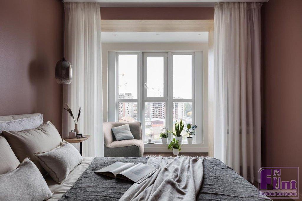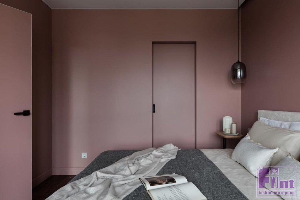 В спальне установили кровать и соорудили небольшую зону отдыха у окна – её выделили другим цветом стен. В комнате создали обволакивающую атмосферу за счёт сложного пудрового оттенка краски Brown Rose, который идеально сочетается с натуральными фактурами льна и хлопка. Двери со скрытой системой монтажа не перетягивают на себя внимание, буквально растворяясь в пространстве. Встроенный шкаф при входе и отдельная гардеробная в спальне обеспечили большое количество мест для хранения.