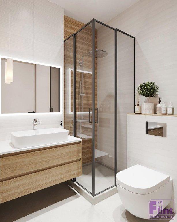 В ванной комнате заказчица попросила оставить только душевую кабину, а на освободившемся пространстве оформить постирочную зону со стиральной машиной и дополнительной системой хранения. Для отделки санузла использовали плитку разной фактуры и цвета. Получилось довольно интересно и деликатно.