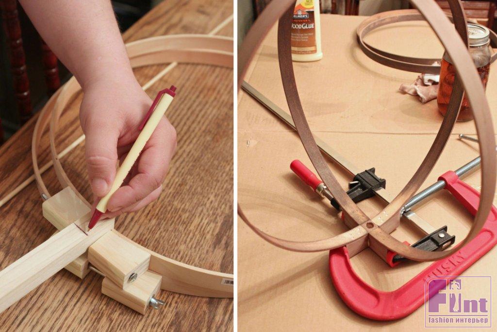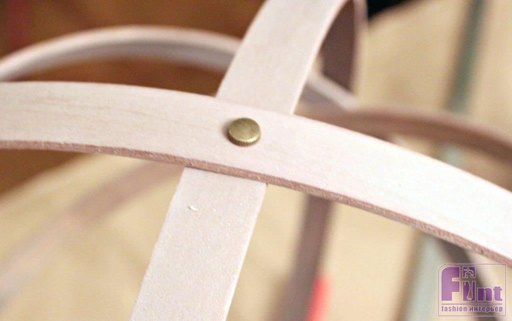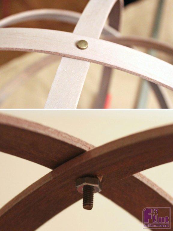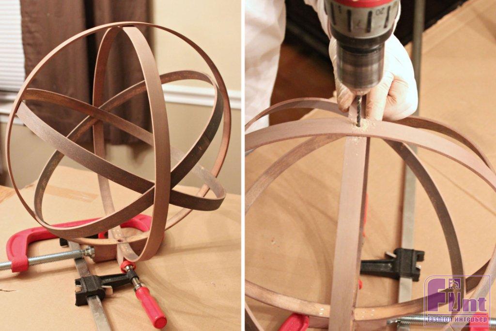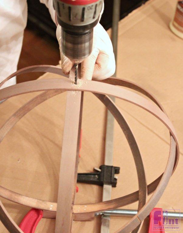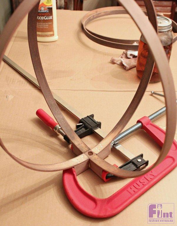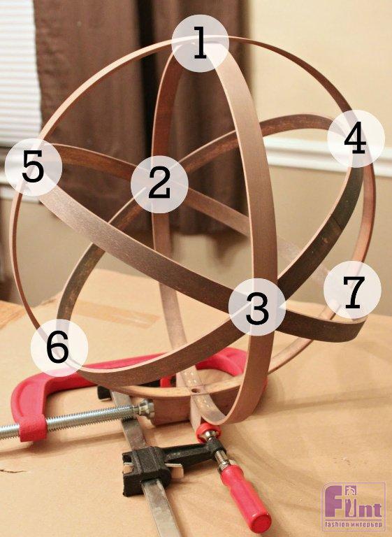 Снимите крепёжные элементы пяльцев и расположите отпиленный брусок между крепёжными частями внешних обручей пялец. Приклейте пяльцы к бруску при помощи клея по дереву. Затем вставьте внутрь получившейся конструкции обручи пяльцев меньшего диаметра, скрестив их под нужным углом. У вас должна получиться своеобразная сфера из обручей, расположенных симметрично друг к другу и к центру конструкции.
