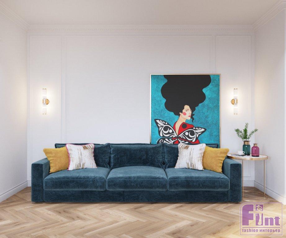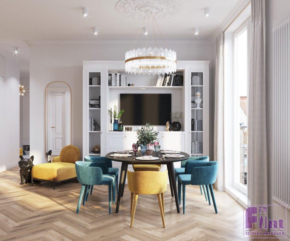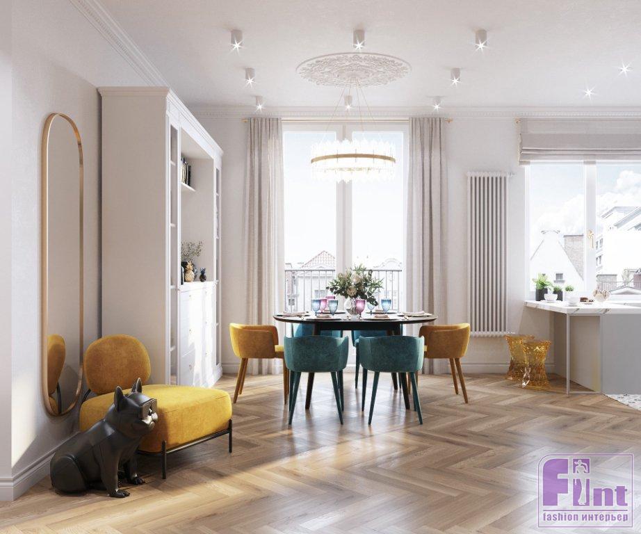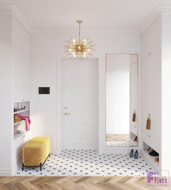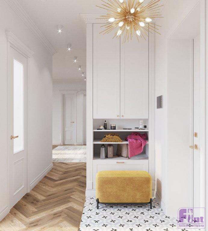 Создатель и руководитель дизайн-студии Plan A из Санкт-Петербурге дизайнер Елена Лебедева придумала интерьер для семейной пары с дочками разного возраста. Квартира, проект дизайна интерьера которой выполнила Елена, является частью сталинского дома постройки 30-х годов прошлого века. Заказчикам хотелось освежить обстановку, но оставить определённое очарование исторической постройки. Автор проекта выбрала беспроигрышное сочетание — белые стены с лепниной и паркет с классическим рисунком «ёлочка». К этой базе можно было легко добавлять разные цвета по настроению. Например, жёлтый цвет напоминает о лете, отпуске и отлично сочетается с золотой фурнитурой.