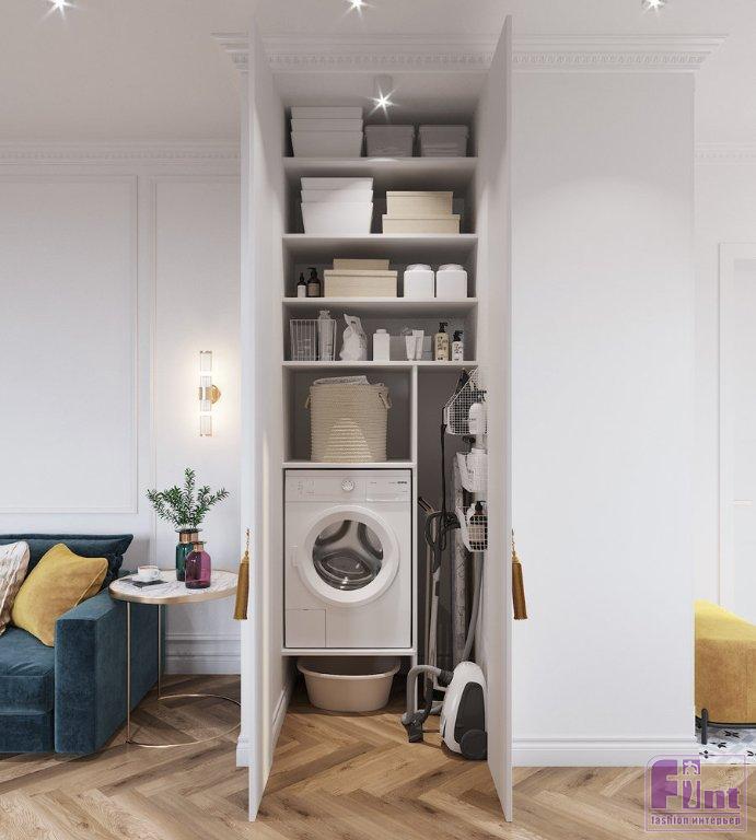 На стенах и потолке использовали белую краску — её легко реставрировать, даже не нужно подбирать колер. Для пола выбрали классический паркет с рисунком «ёлочка», который отлично сочетается с окнами в пол, коваными балконными ограждениями и интерьером в целом. Прихожую и коридор немного увеличили, чтобы выделить «грязную» зону. Стиральную машину со всеми необходимыми атрибутами спрятали в глубоком шкафу.