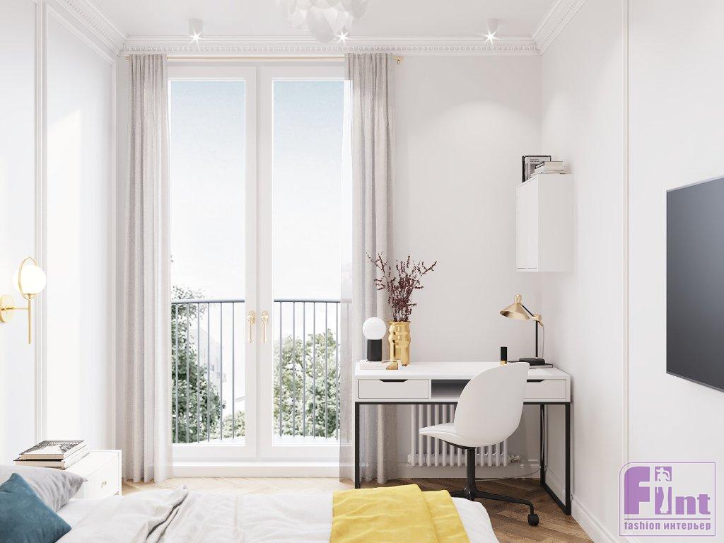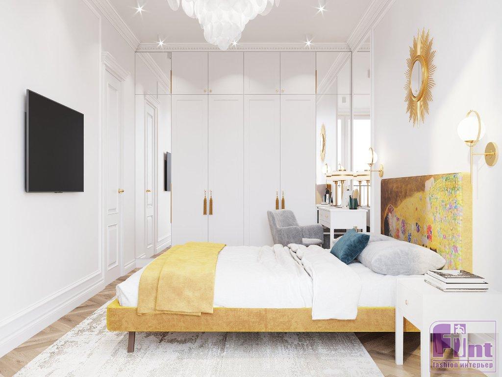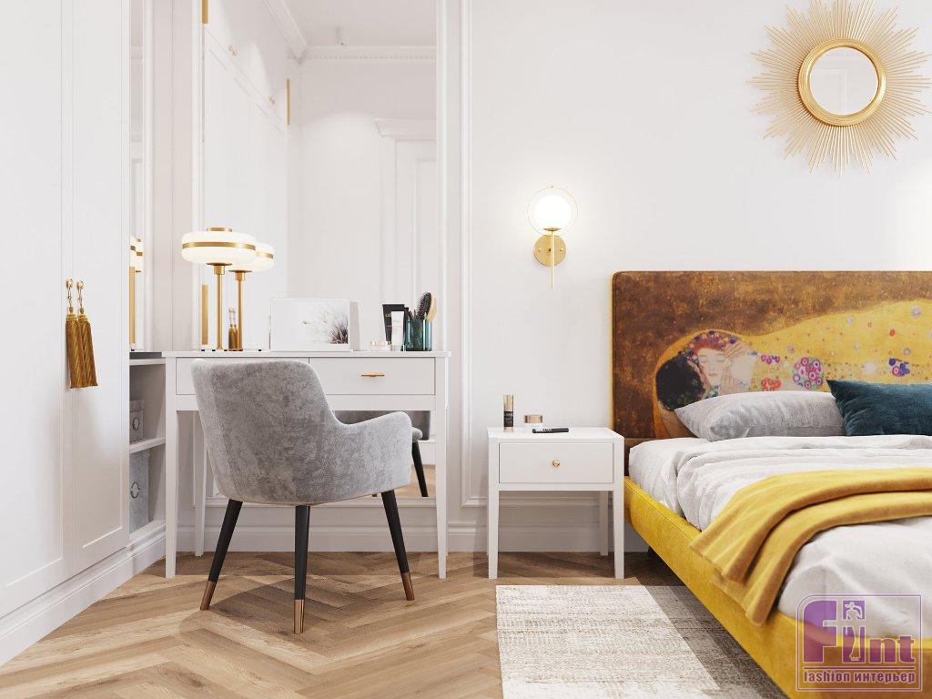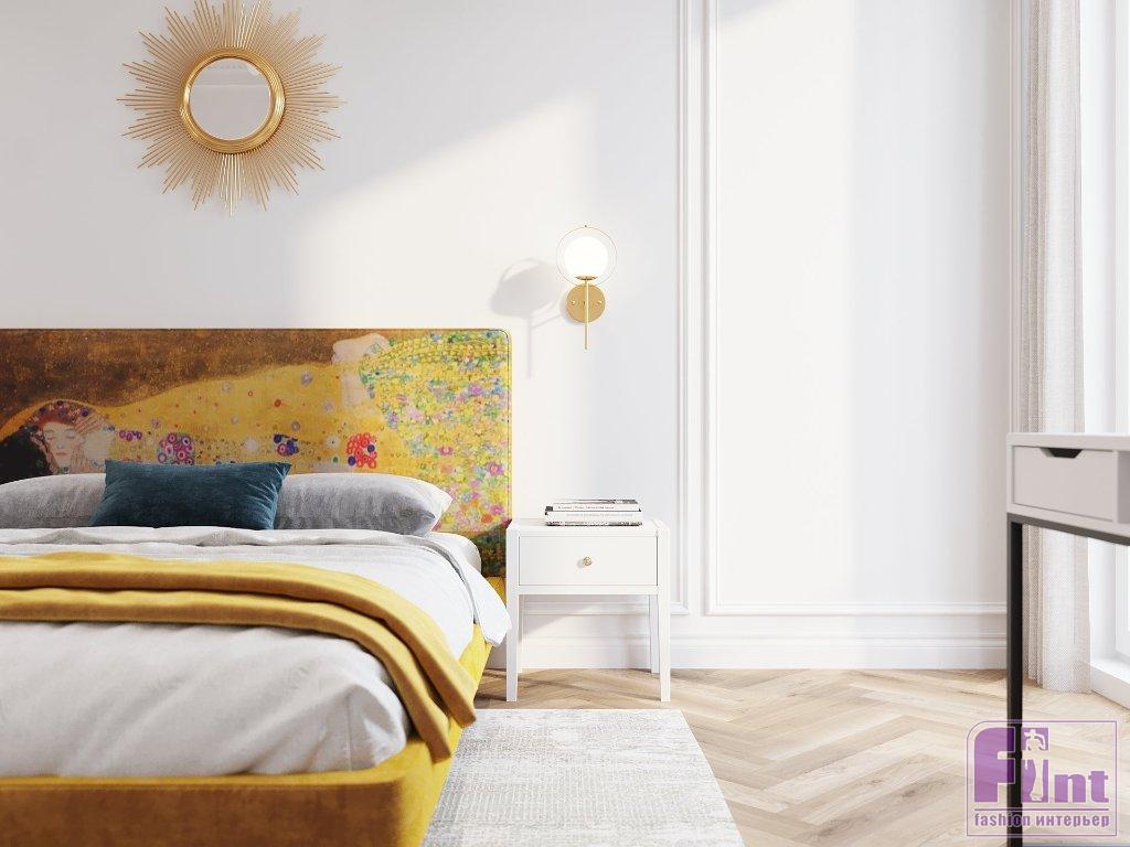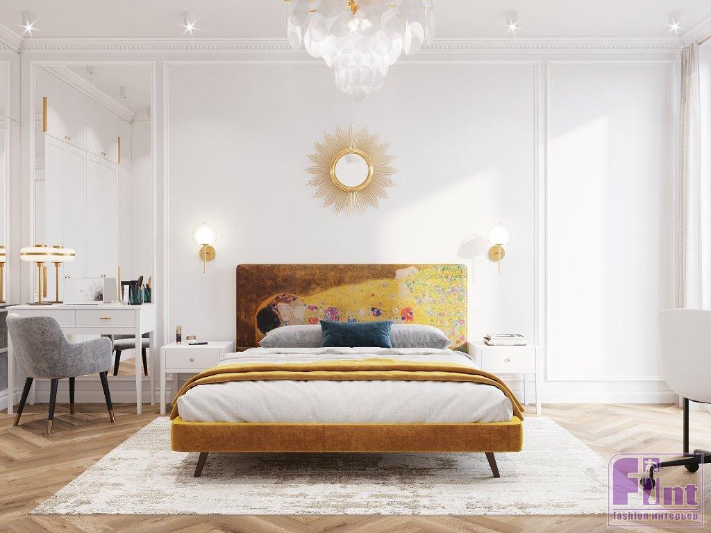 Необычные дизайнерские решения Елена Лебедева воплотила в жизнь в хозяйской спальне. Дизайнер подобрала кровать с мягким изголовьем, на котором изображена одна из самых известных картин Густава Климта «Поцелуй». Белый шкаф с зеркальными створками слился со стенами и не выглядит громоздким, хотя он очень вместительный. Около окна оборудовали второе рабочее место.