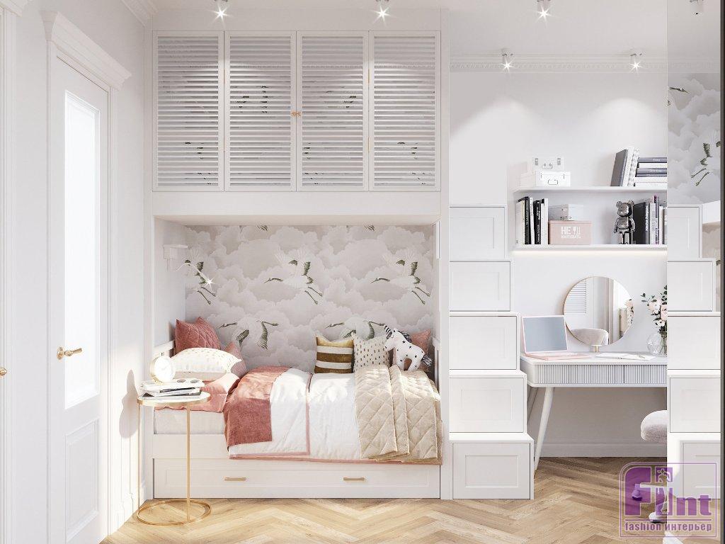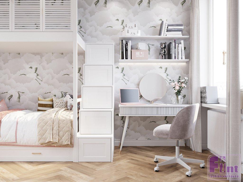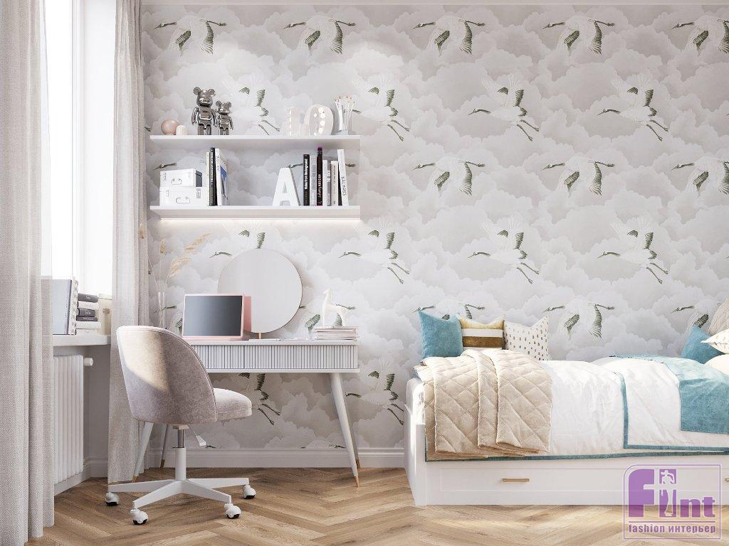 Детские комнаты выполнены с учётом общей стилистики проекта. В помещениях установлена белая мебель, а в качестве цветового акцента выступают стильные фотообои, изготовленные на заказ по эскизам дизайнера. Для отделки двух детских выбрали одинаковые изображения, которые впоследствии напечатали на обоях. Теперь стены детских комнат украшают грациозные журавли, парящие в небе среди облаков. Вся мебель создана с учётом требований безопасности. Дверцы на втором ярусе кровати закрываются щеколдами, что исключает непреднамеренное падение ребёнка со второго яруса своего спального места.