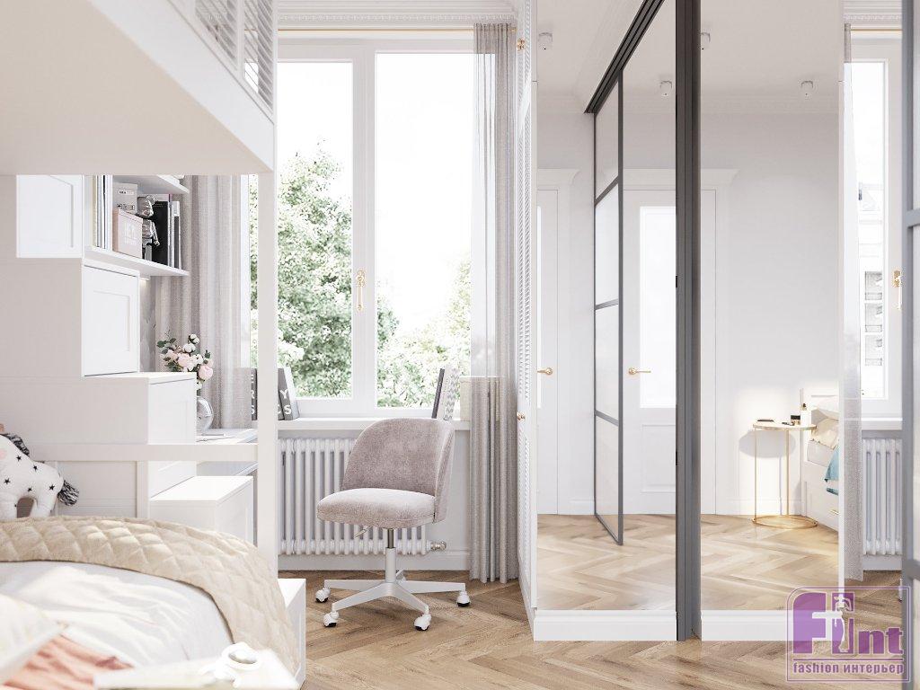 При работе с планировкой дизайнеру было важно выделить полноценную спальню для родителей, создать две детские комнаты и объединить кухню с гостиной. Левая комната была отдана под спальню. В ней поместились: большая кровать, два рабочих места и системы хранения. Для детских выбрали интересное дизайнерское решение: их сделали симметричными и практически одинаковыми, чтобы между дочками не было споров. Внутренняя межкомнатная перегородка — это раздвижная система, которая позволяет объединять комнаты в случае необходимости.