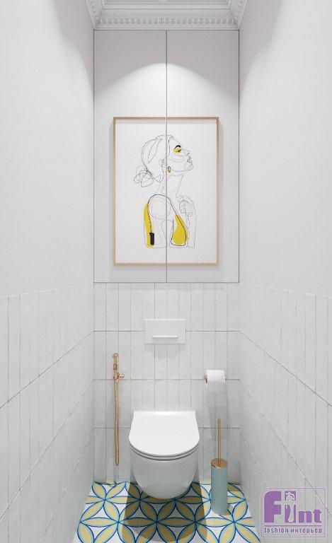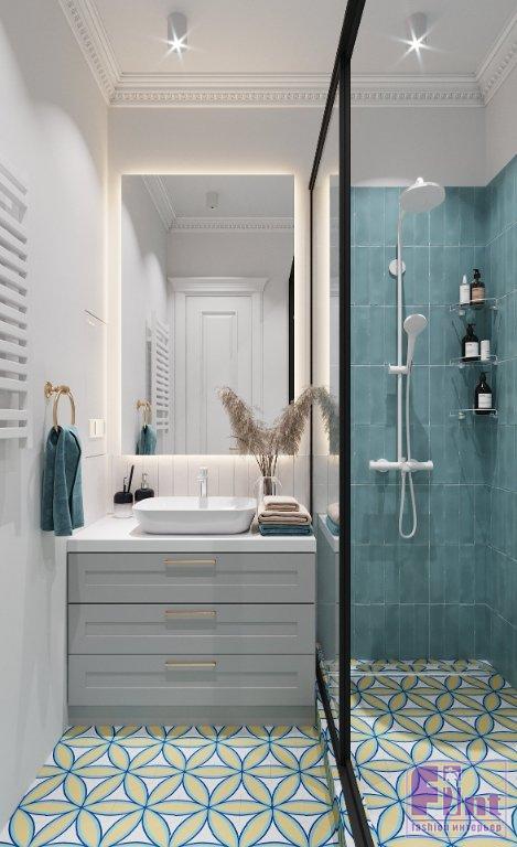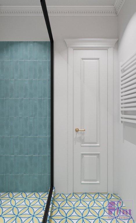 Дизайн санузла Елена построила на использующихся во всём интерьере цветах: белом, бирюзовом и жёлтом. Белый цвет нашёл своё место не только на привычных плоскостях стен, но и в отделке полотенцесушителя и даже душевой системы с кранами. Бирюзовый оттенок оттенил и зонировал душевую кабинку, дополнением к которому выступает яркая керамическая плитка на полу с классическим узором в бирюзово-жёлтой цветовой гамме.