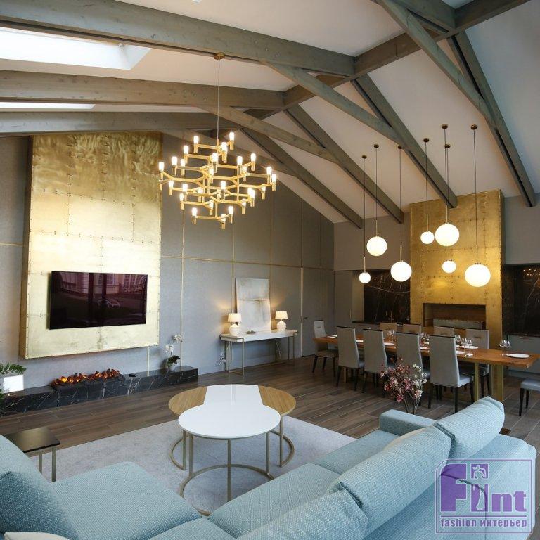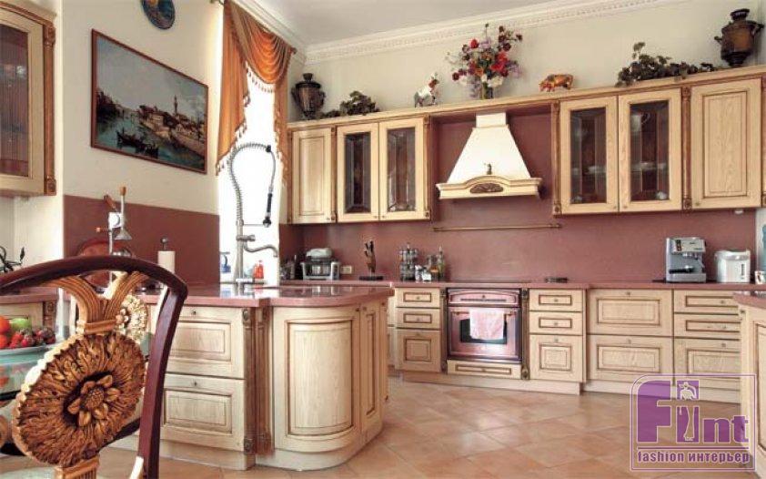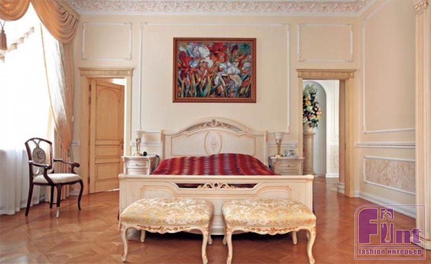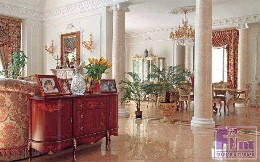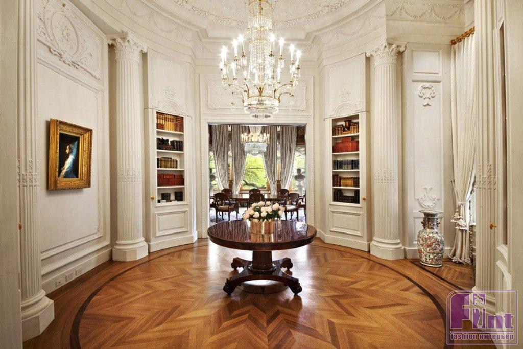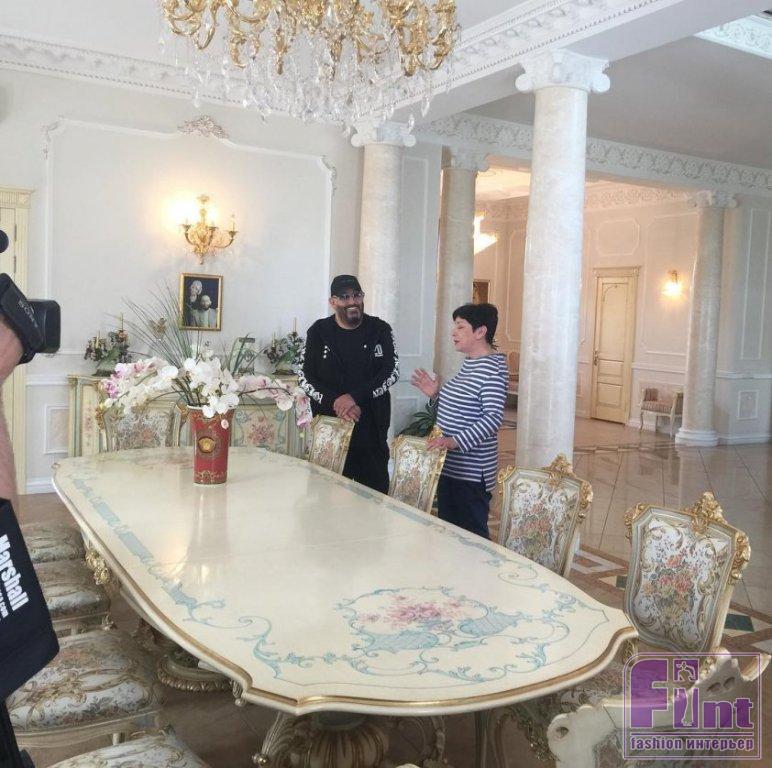 Основной фон интерьера — светлый. На стенах зеркала, картины, подсвечники. Дорогая, роскошная, массивная мебель. Кухня весьма просторна, с удобной рабочей зоной в центре. На территории особняка также оборудовано помещения для обслуживающего персонала, собственная автомойка, несколько гаражей.