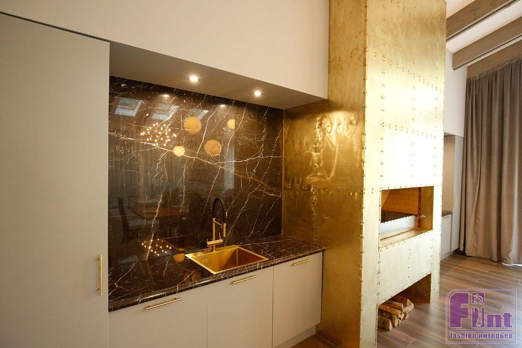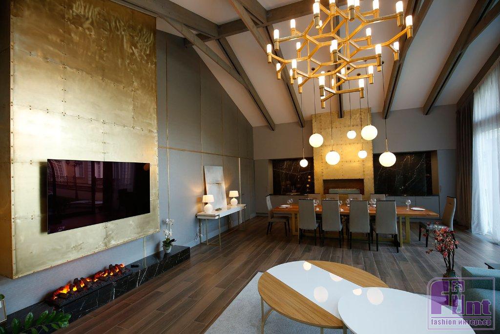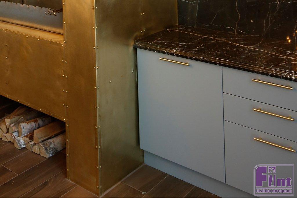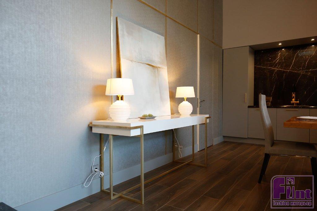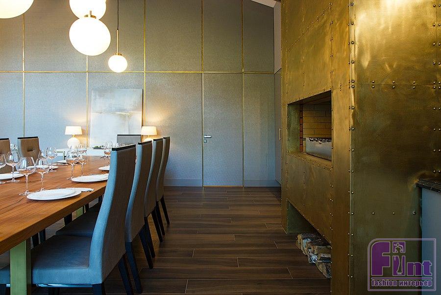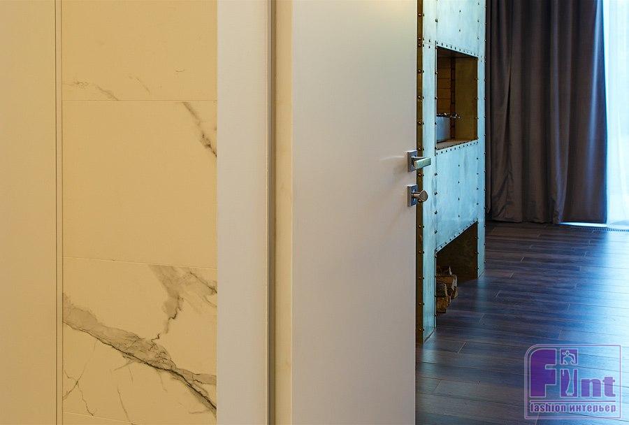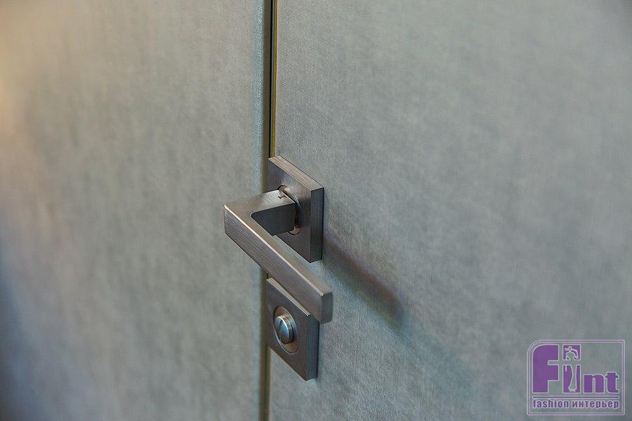 Для оформления этого нового пространства были использованы необычные двери скрытого монтажа российского производства. Стильные дверные полотна обшили мягкой эко-кожей – тем же материалом, которым обили стены, и акцентировали элементами из латуни.