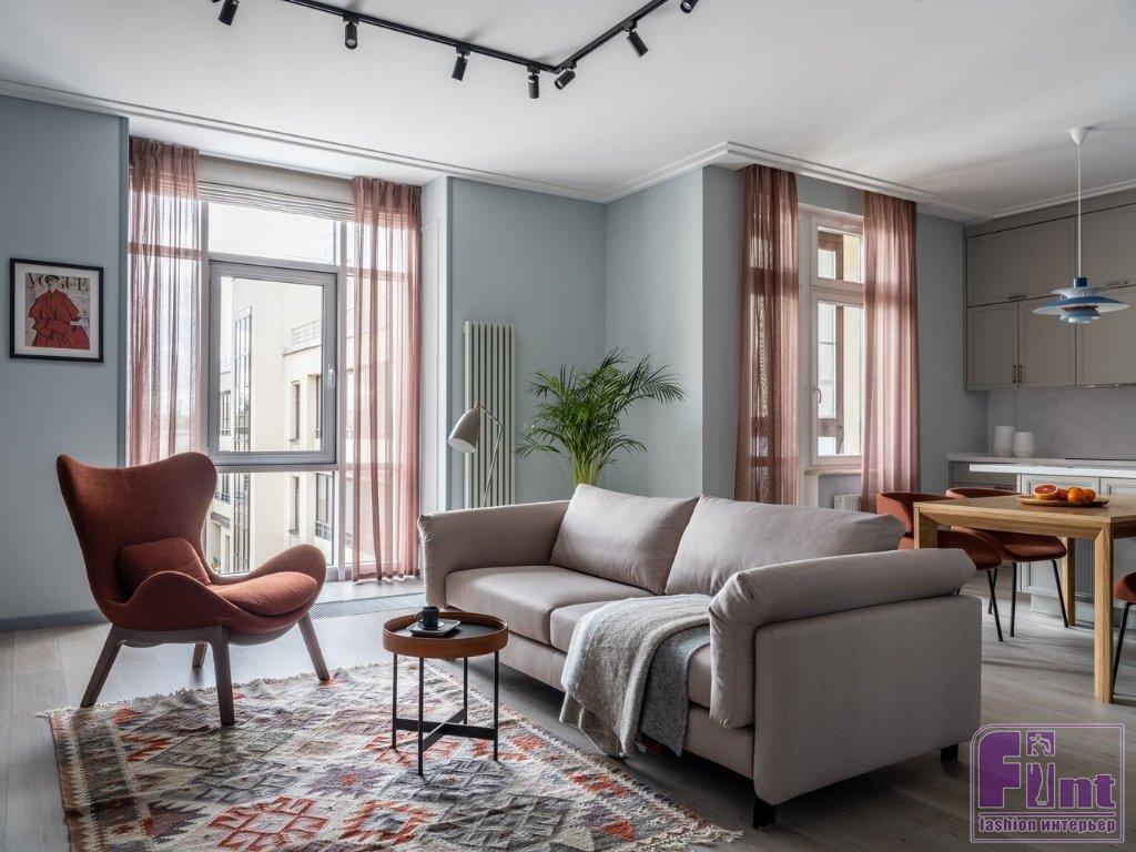Эта просторная квартира находится в самом центре Санкт-Петербурга, в одном из новых жилых комплексов на Петроградской стороне. Хозяйка — молодая девушка, студентка. Заказчица — смелый человек, готовый к экспериментам, любительница скандинавской мебели и интерьеров в стилистике 60-х годов. Поэтому дизайнер по интерьерам, создатель и руководитель студии SOL Design Светлана Оленбург предложила выкрасить стены в сложные цвета: оттенки зелени, моря, песка и яркого заката. Эти деликатные крашеные стены стали идеальным фоном для всего интерьера квартиры.