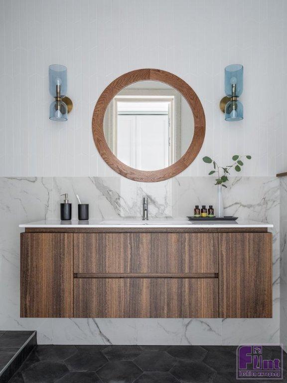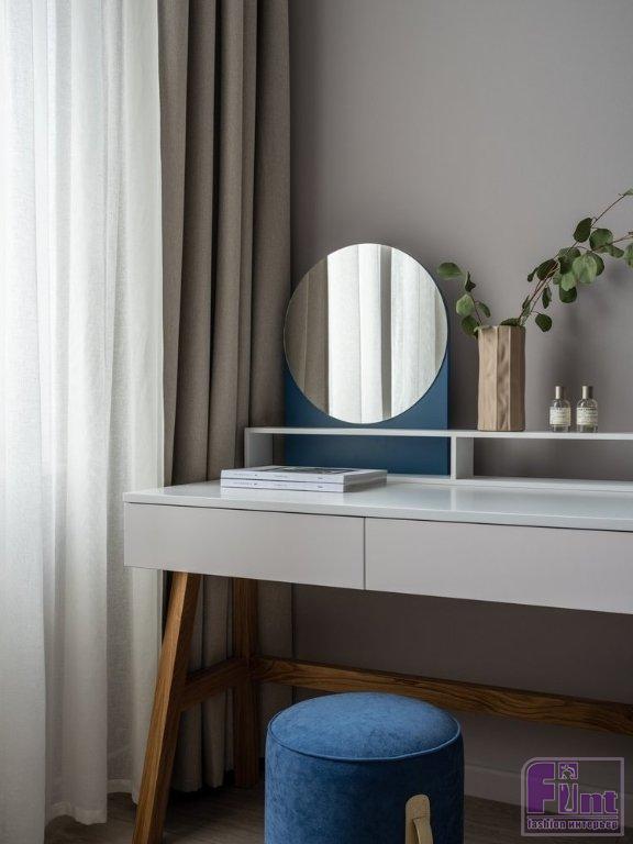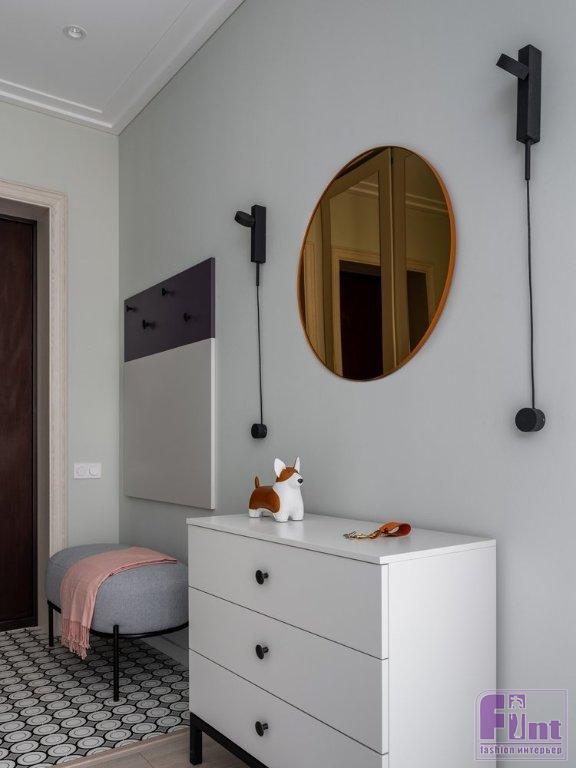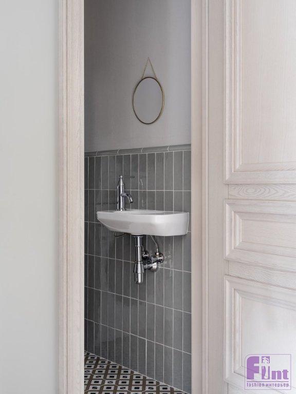 На этапе создания проекта заказчица купила ковёр, который впоследствии задал направление в подборе цветовой гаммы. Можно сказать, интерьер построился вокруг ковра. «Во время ремонта не было до конца понятно, будет ли здесь жить заказчица, или квартиру будут сдавать в аренду. Поэтому решили использовать довольно демократичные по стоимости материалы, которые можно быстро заменить. Так, на полу постелили инженерную доску, все стены подготовили под покраску. В санузлах плитка из Испании», — рассказывает дизайнер. Кстати, в санузлах Светлана предложила использовать сочетание разных видов и форм плитки. Получилось необычно.