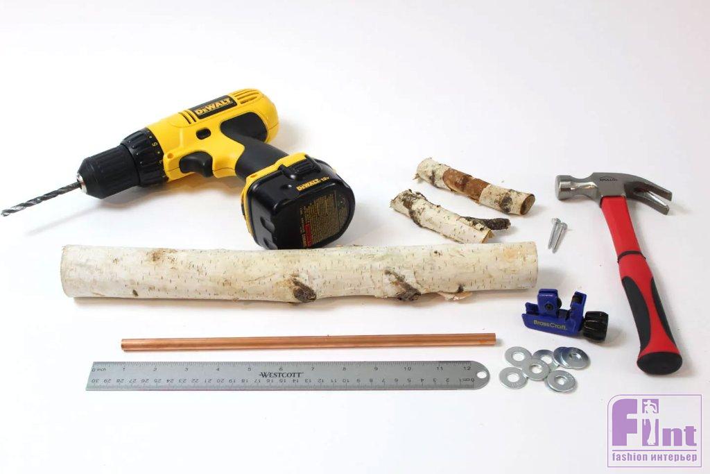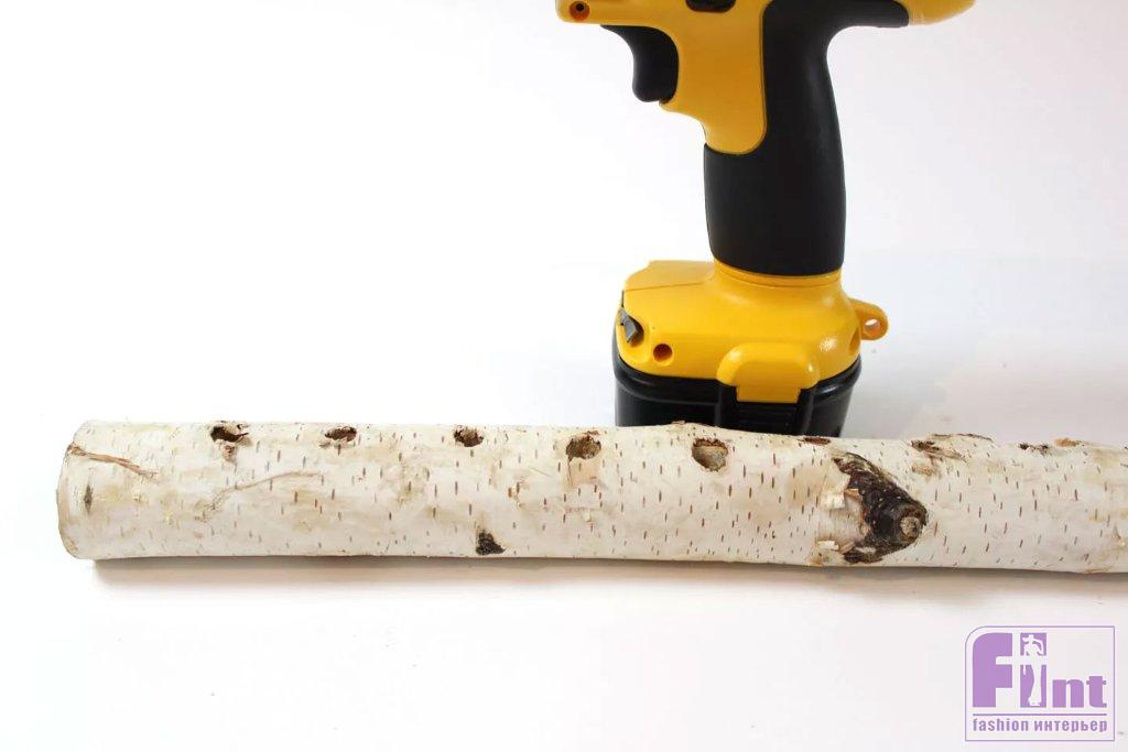 Используя электрическую дрель или шуруповёрт со сверлом диаметром в 8-9 мм, просверлите в толстой берёзовой ветке девять отверстий по одной линии на расстоянии примерно 3-4 см друг от друга. Отверстия должны быть такими, чтобы в них плотно входили отрезки вашей медной трубки.