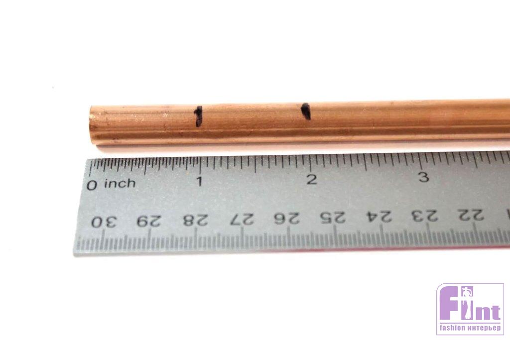 В качестве держателей свечек в этом подсвечнике будет выступать медная трубка, которую можно купить в любом магазине сантехники. Используя маркер и линейку, отметьте на медной трубке 8 отрезков по 2,5 см, и один отрезок в 7 см.