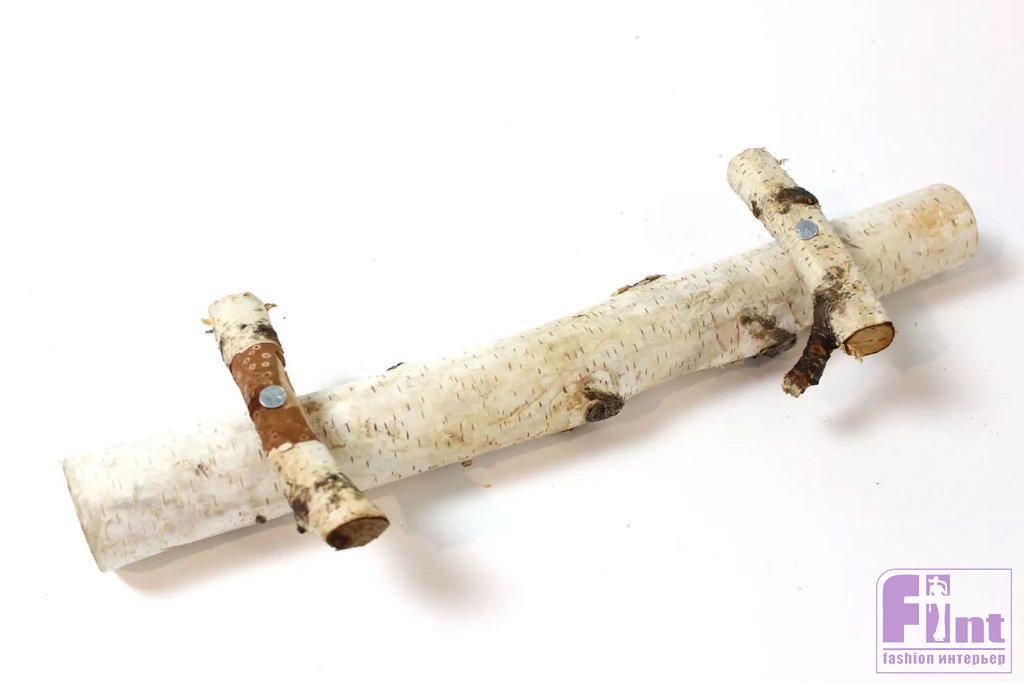 Две березовые ветки поменьше станут ножками нашего подсвечника.Переверните длинную ветку, чтобы отверстия, которые вы просверлили, находились внизу.Затем прибейте две меньшие ветви примерно в 7 см от концов толстой ветки под углом в 90 градусов.Чтобы случайно не расколоть веточки, их можно предварительно просверлить тонким сверлом, или несколько раз ударить молотком по острому концу гвоздя, сделав его более тупым.